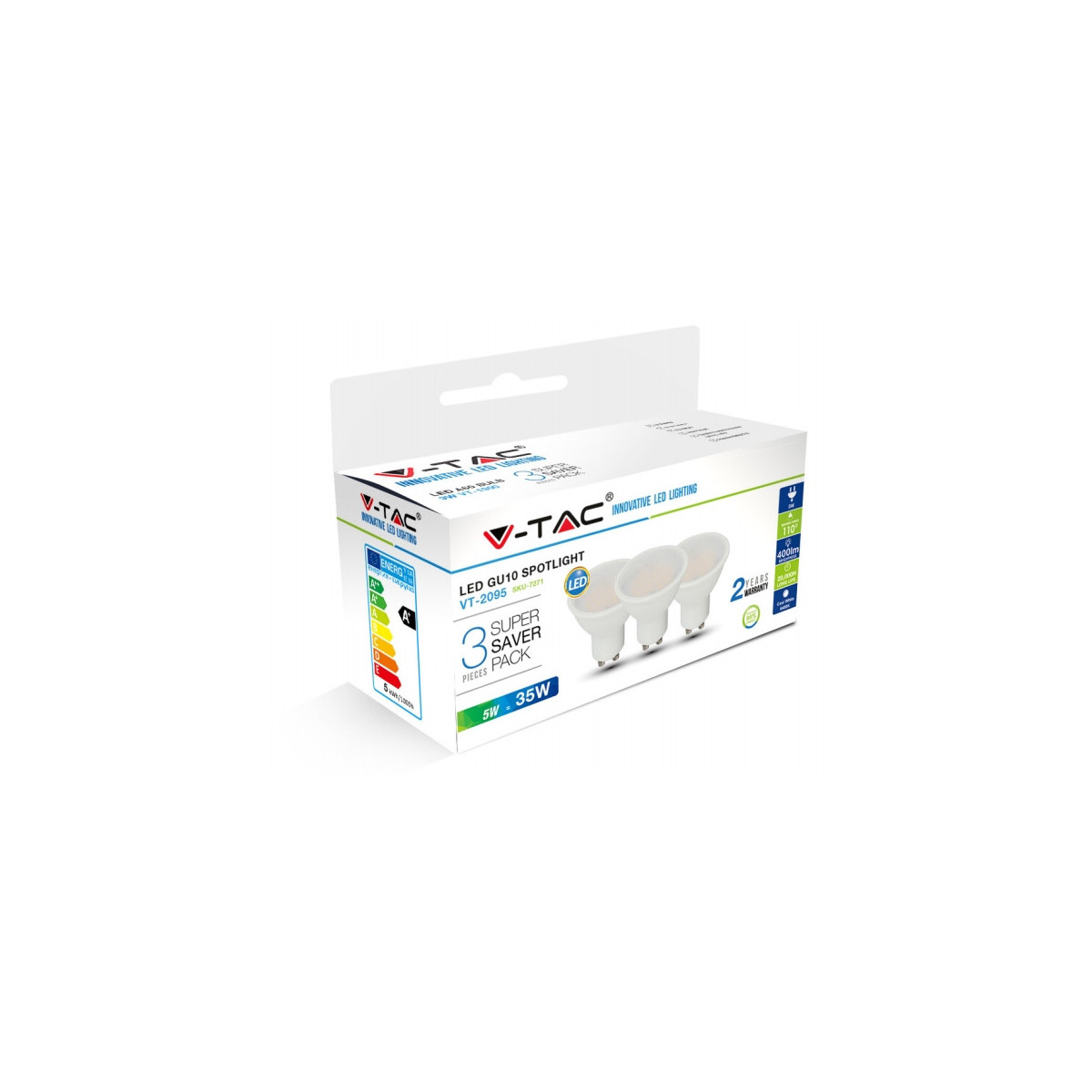 V-TAC 7271. Potenza lampadina: 5 W, Lampadina di potenza equivalente: 35 W, Attacco lampada: GU10, Flusso luminoso: 400 lm, Durata della lampadina: 20000 h, Colore della luce: Bianco, Temperatura colore: 6400 K, Angolo proiezione: 110°, Color Rendering Index (CRI): 80, Fattore di potenza: 0,4