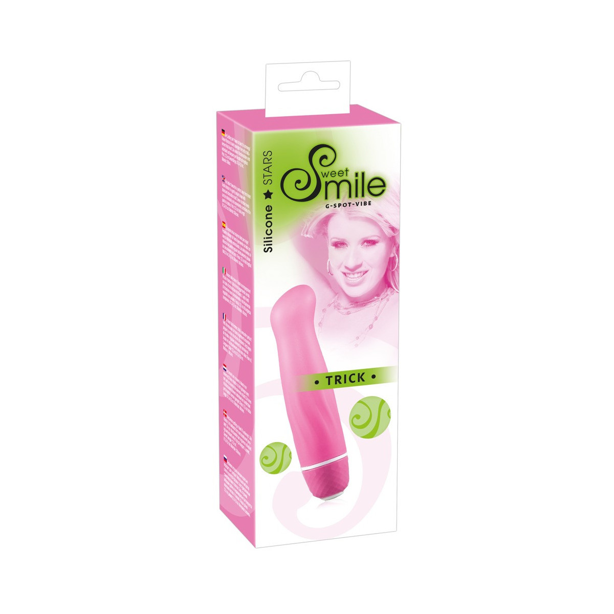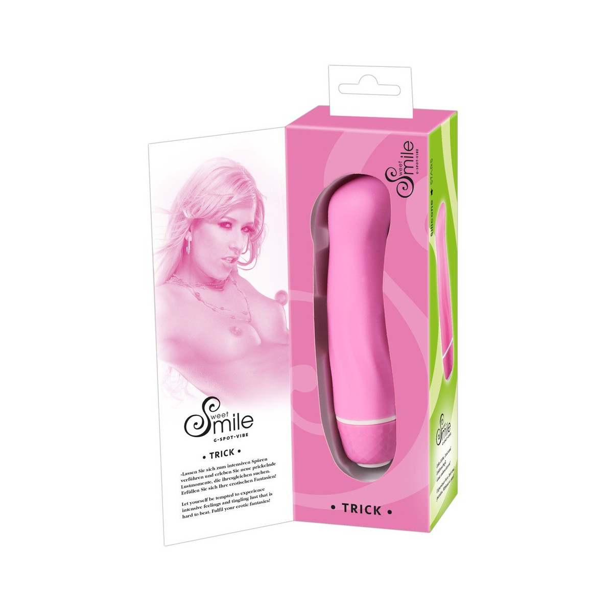 Mini vibratore Trick di Sweet Smile con punta di piacere inclinata e fusto testurizzato nel colore rosa di tendenza - può essere riposto in ogni borsetta ed è il compagno ideale per i viaggi... 7 modalità di vibrazione sono comodamente regolabili con la semplice pressione di un pulsante.
