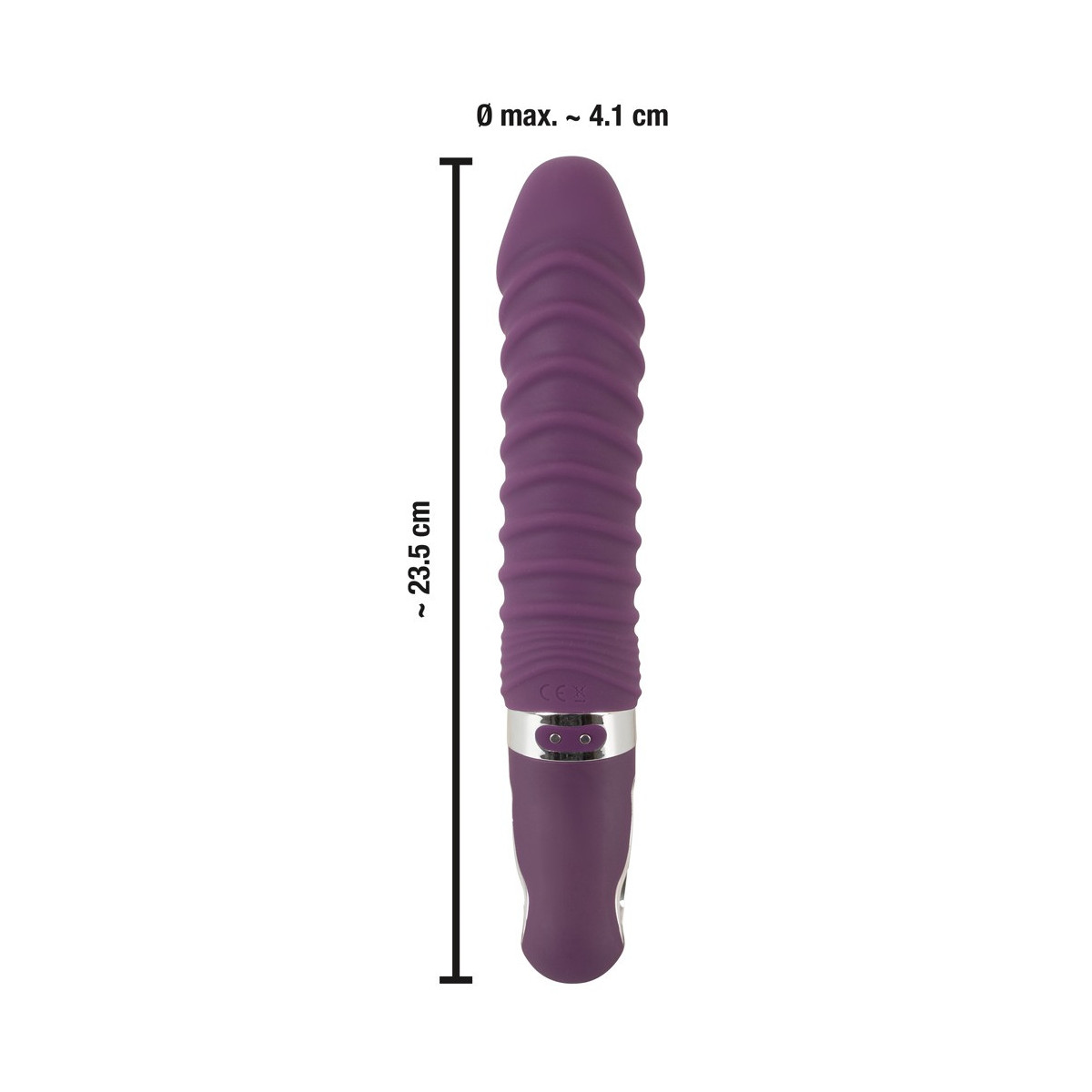Lunghezza totale 23,5 cm. Lunghezza d'inserimento 14,7 cm. Ø da 3,5 cm a 4,1 cm. Silicone (silicone liquido), PU, ABS.