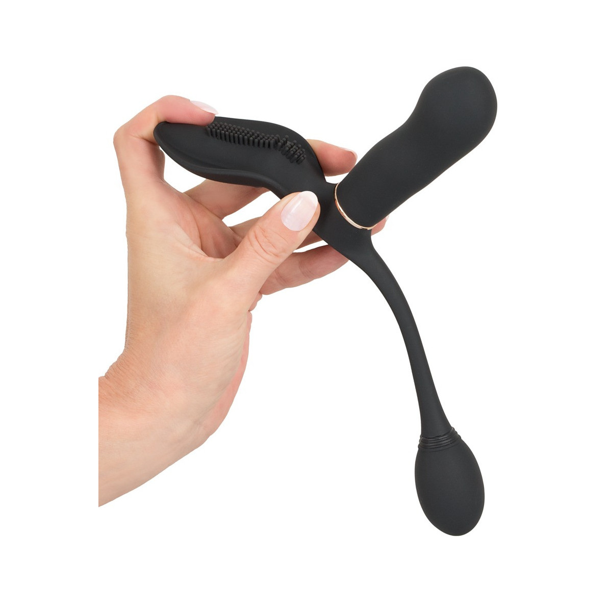 Lunghezza totale 24,5 cm, lunghezza d'inserimento vibratore 9,5 cm, lunghezza d'inserimento vibro sfera 4,7 cm, Ø 2,9 cm. Silicone, PU, ABS.