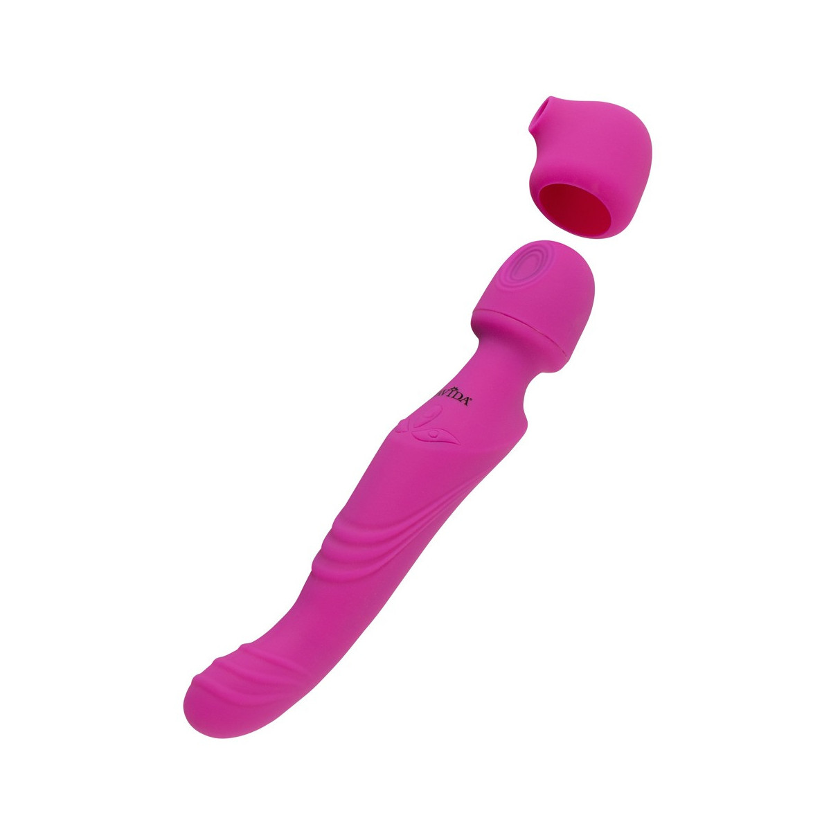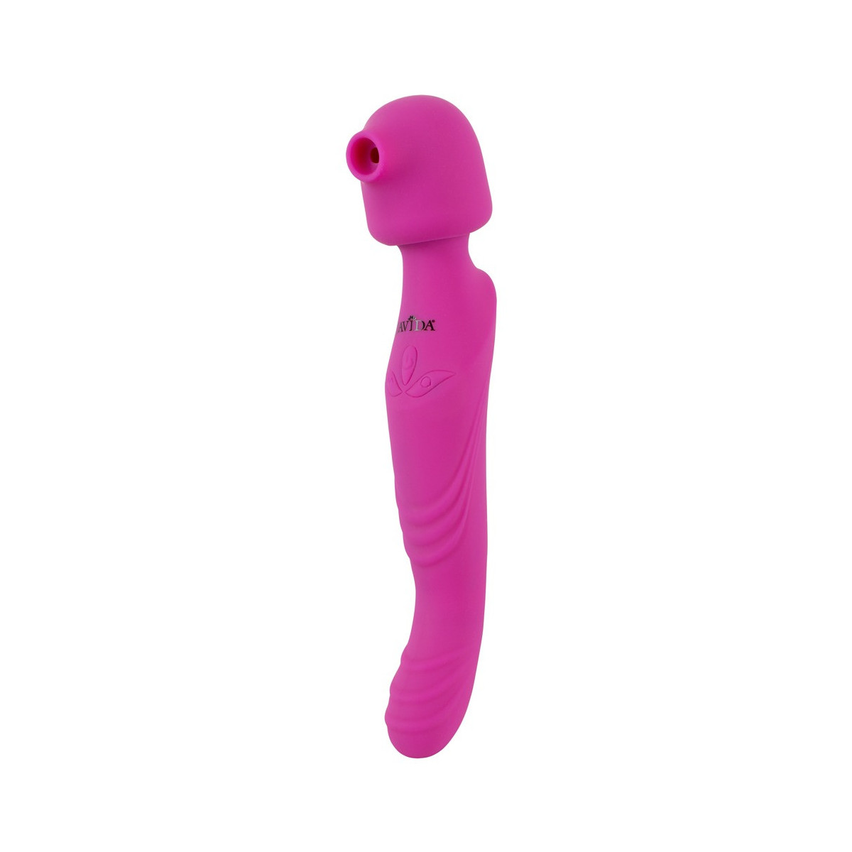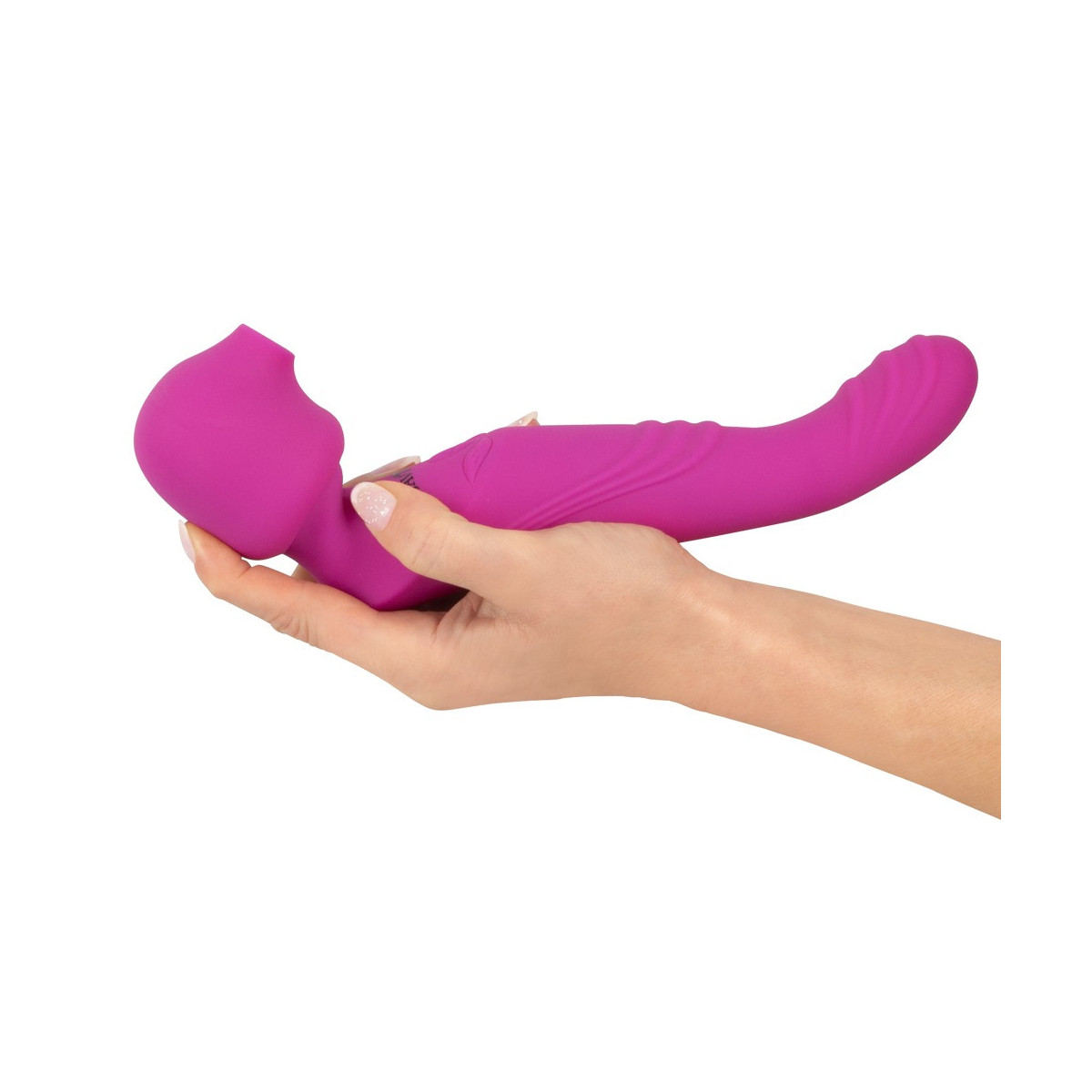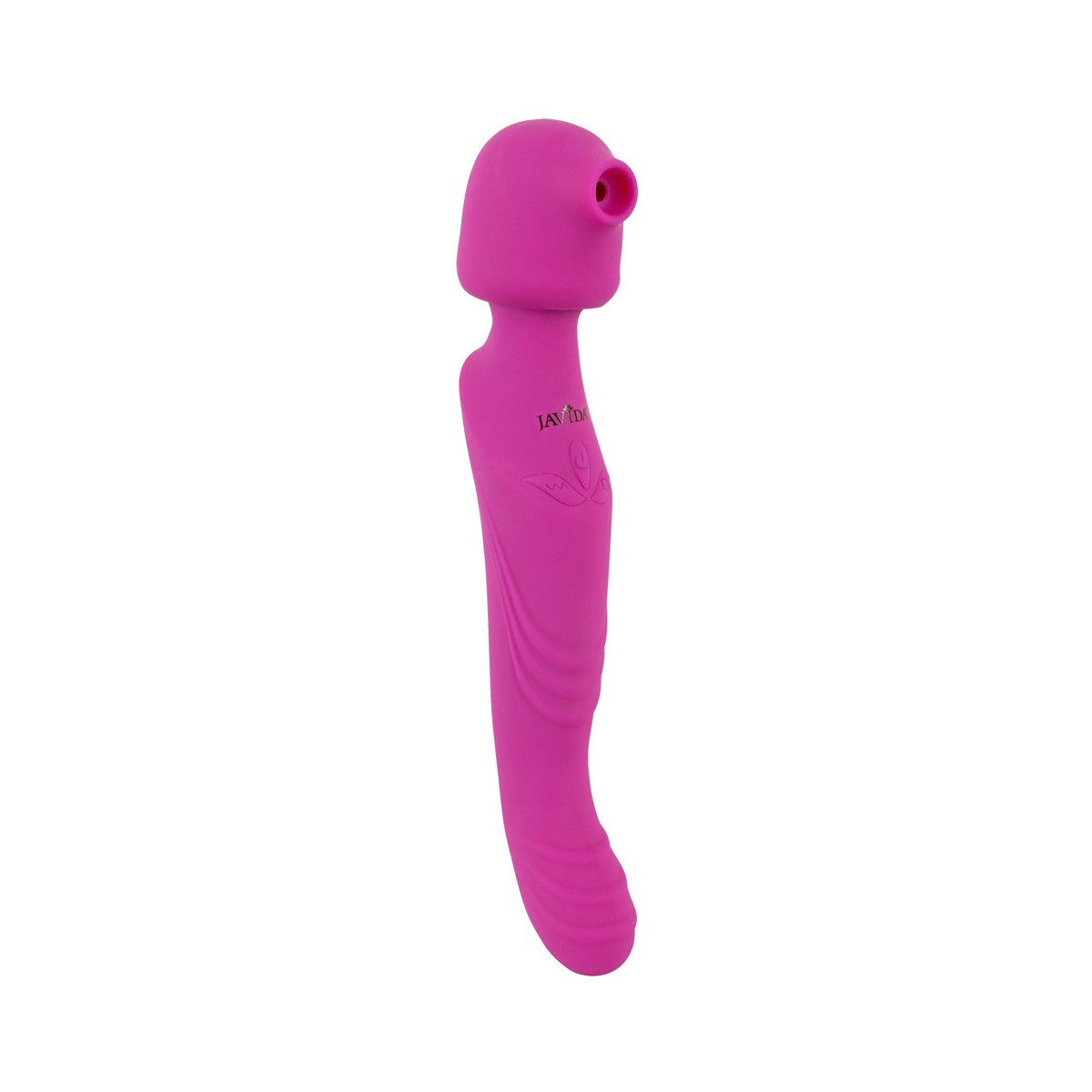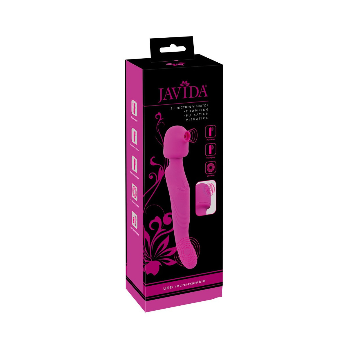 Vibratore bifacciale a 3 funzioni di Javida per la stimolazione mirata dei punti di piacere e per massaggi completi o intimi. Un lato massaggiatore con testa a sfera mobile e manicotto (incluso) per la funzione di pulsatore/aspirazione - e senza manicotto per la funzione di picchiettamento, l'altro lato con vibratore ottimamente curvato, distintamente scanalato con punta flessibile. Tutte e 3 le funzioni sono controllabili separatamente e comodamente in 10 modalità con la semplice pressione di un pulsante. Rivestito tutto intorno con una consistenza morbida al tatto, il vibratore fornisce una sensazione molto piacevole sulla pelle mentre si gioca e si coccola. Ricaricabile - cavo di ricarica USB incluso.