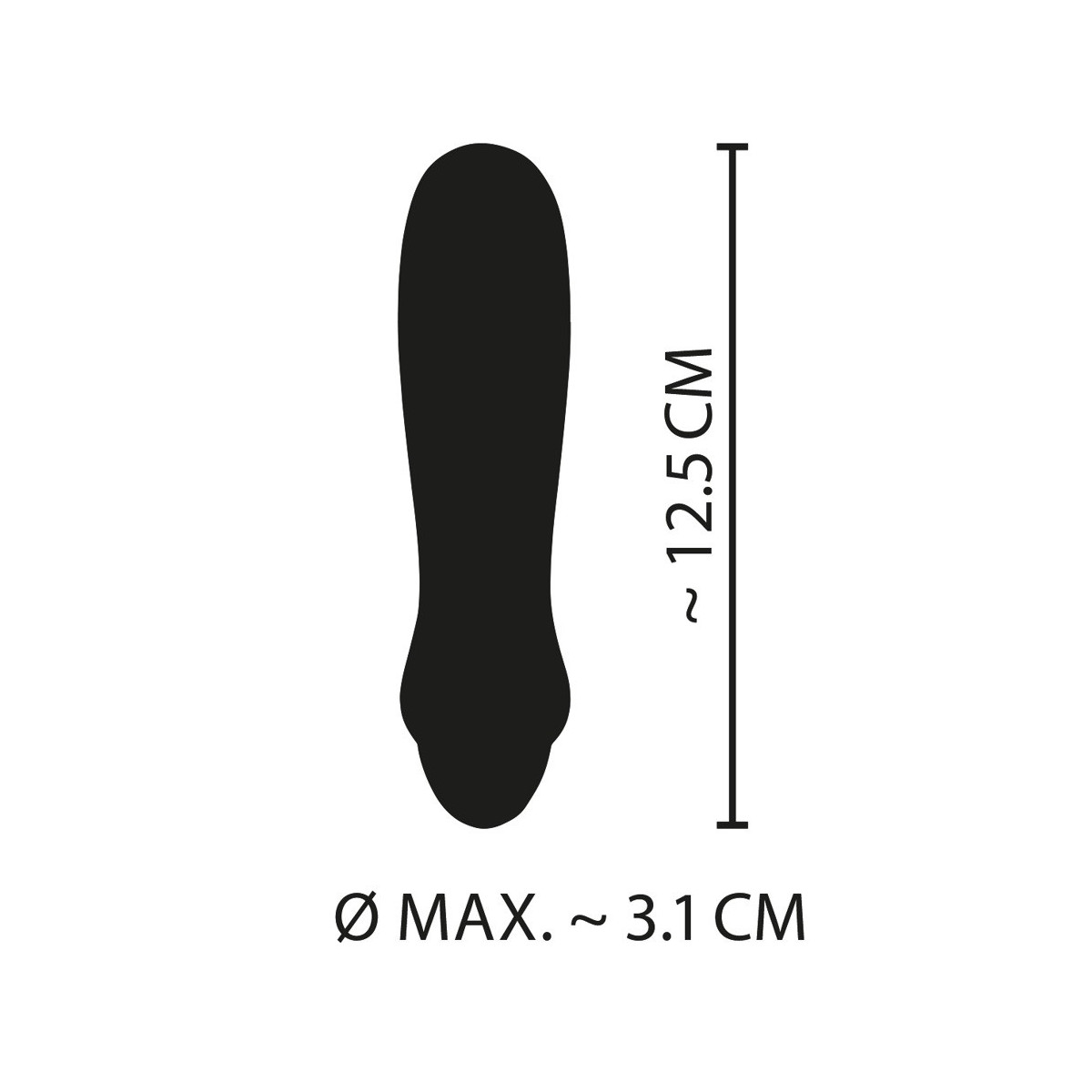 Lunghezza totale 12,5 cm, Ø 2,3-3,1 cm, profondità d'inserimento 8 cm, peso 71 gr. Silicone, rivestimento PU, ABS.