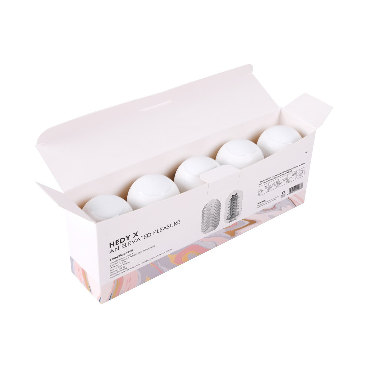 5 x Hedy X Speed masturbatore rimovibile di Svakom, ciascuno nella pratica custodia a uovo che serve anche come distributore di lubrificante, supporto per l'asciugatura e conservazione senza polvere. Il manicotto da masturbazione estremamente elastico e setoso si adatta in modo ottimale a qualsiasi dimensione del pene e può essere usato da 5 a 10 volte. La caratteristica struttura di stimolazione lamellare all'interno del manicotto fornisce un massaggio intenso ed efficace per l'orgasmo durante l'handjob.