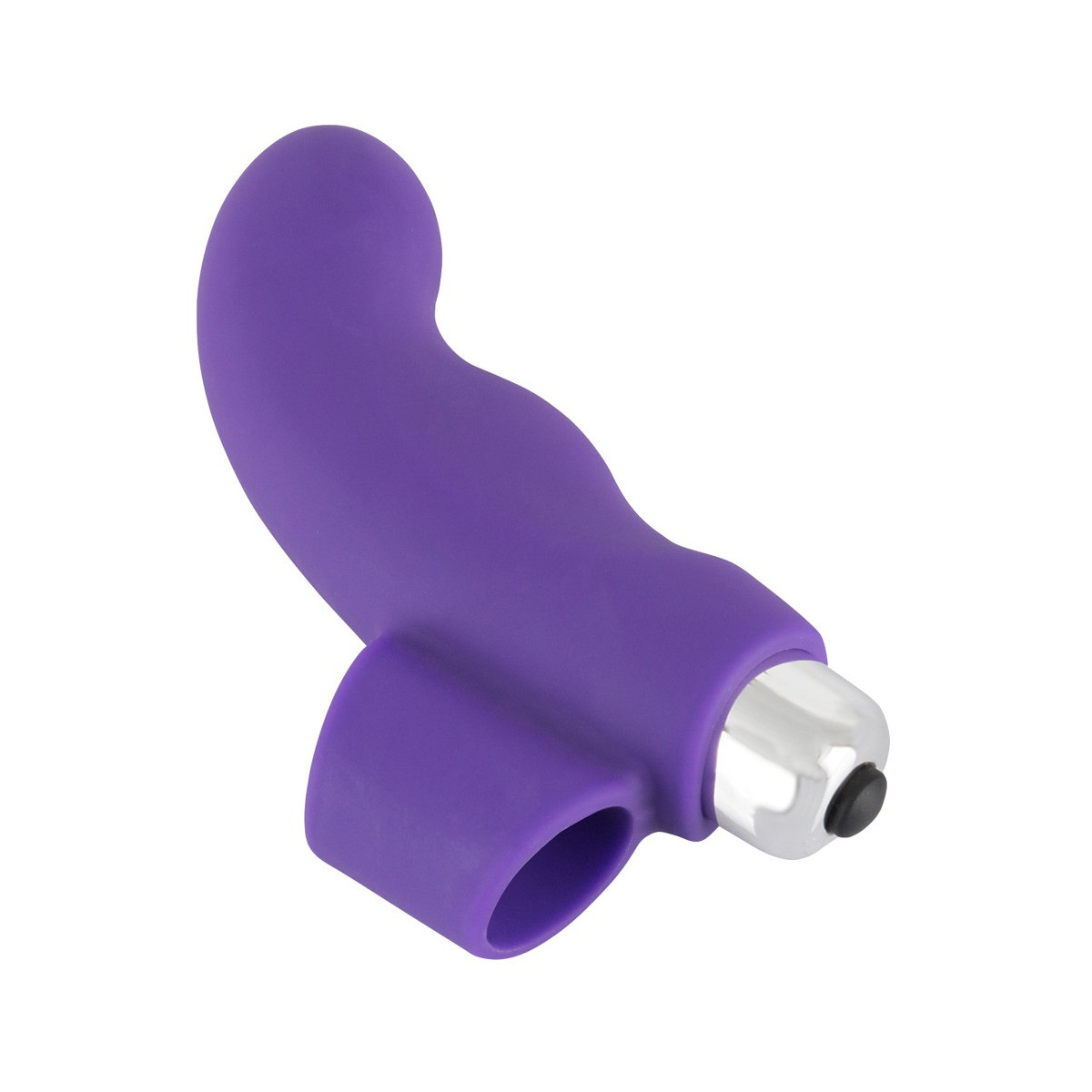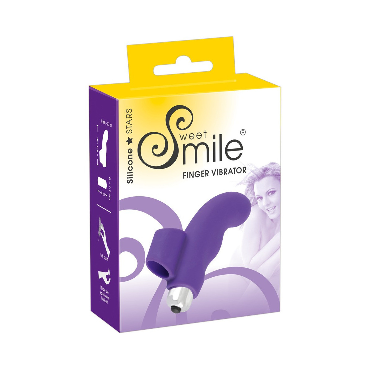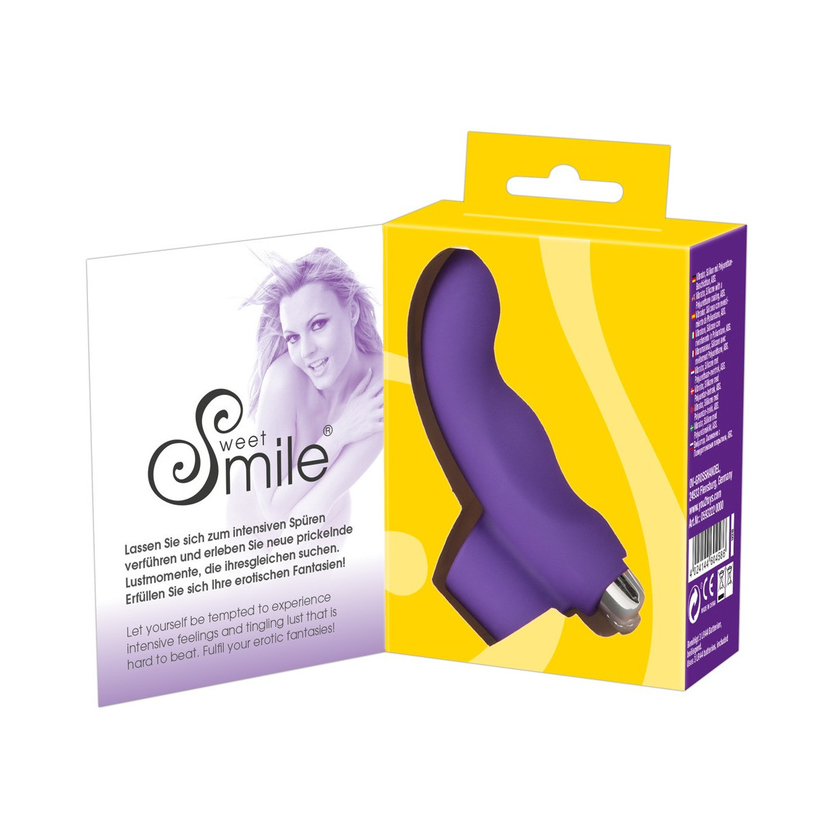 Vibratore per dita viola con punta curva per la stimolazione del punto G. Far scorrere l'anello del dito del vibratore Sweet Smile dito vibratore su un dito e posizionare il mini vibratore incluso nella manica. Lunga 9,3 cm, profondità di inserimento 4,5 cm, à 2,1-2,3 cm; Proiettile lungo 5,9 cm, à 1,7 cm. Silicone con rivestimento in PU. Batterie incluse.