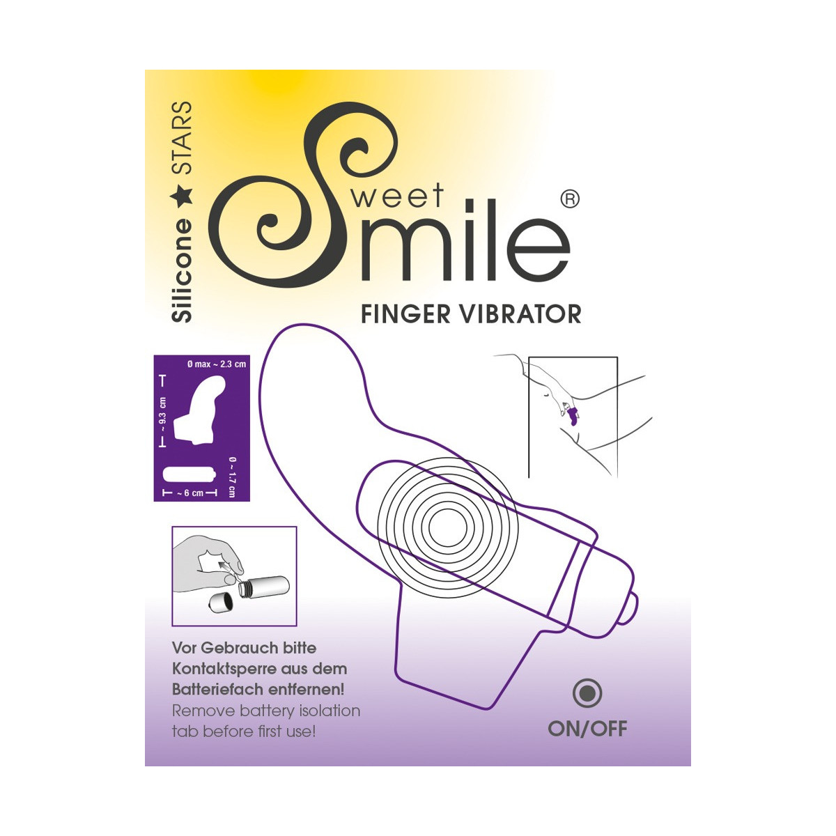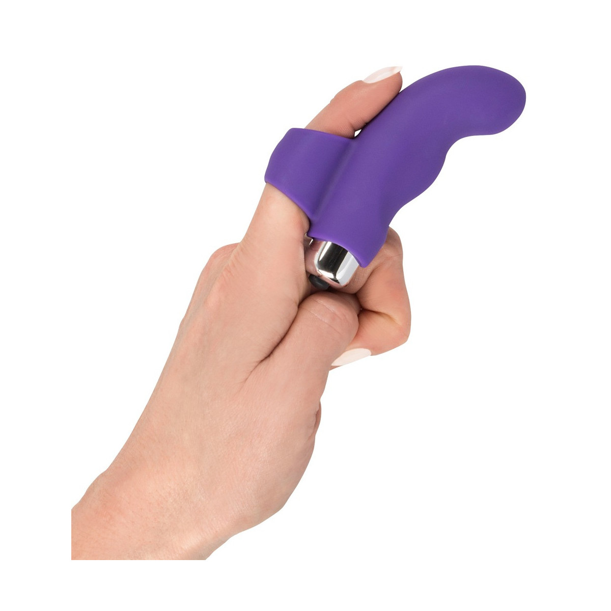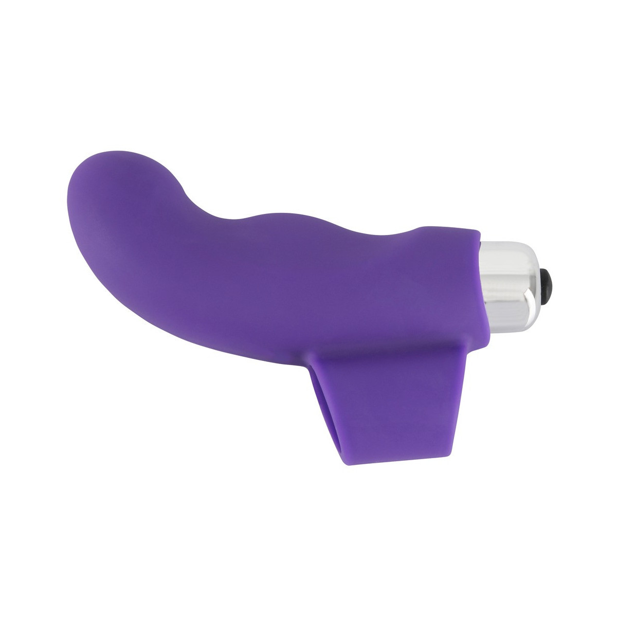 Vibratore per dita viola con punta curva per la stimolazione del punto G. Far scorrere l'anello del dito del vibratore Sweet Smile dito vibratore su un dito e posizionare il mini vibratore incluso nella manica. Lunga 9,3 cm, profondità di inserimento 4,5 cm, à 2,1-2,3 cm; Proiettile lungo 5,9 cm, à 1,7 cm. Silicone con rivestimento in PU. Batterie incluse.