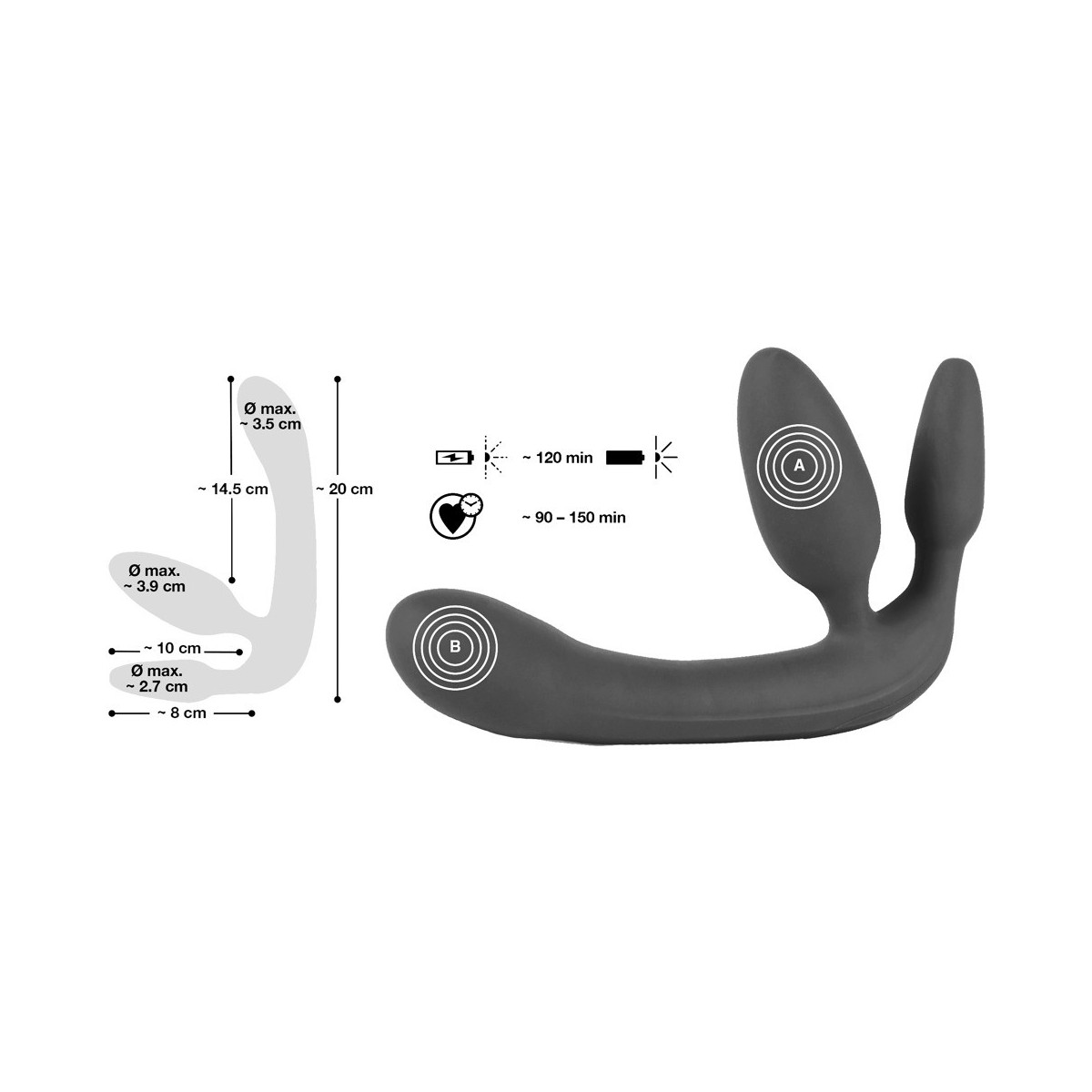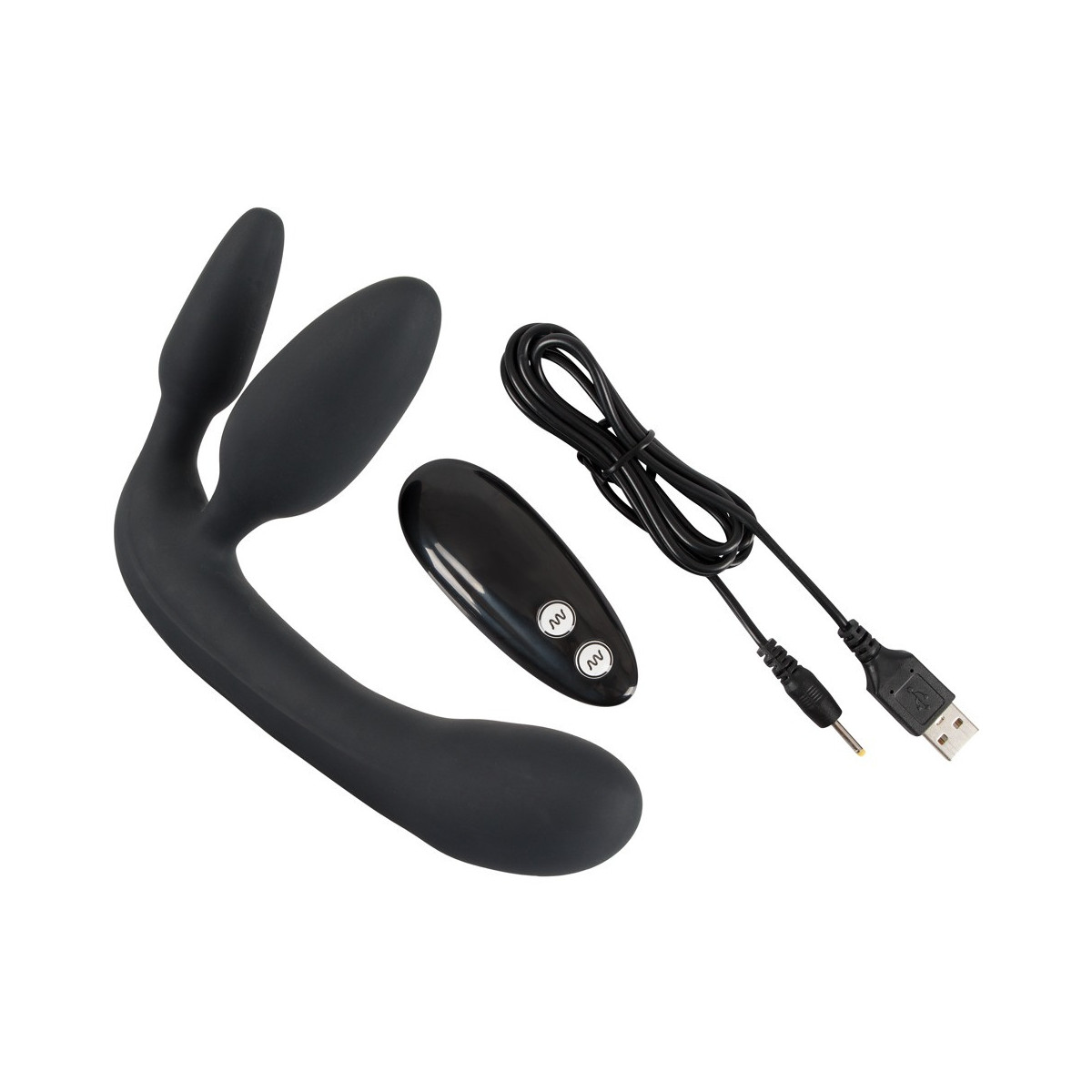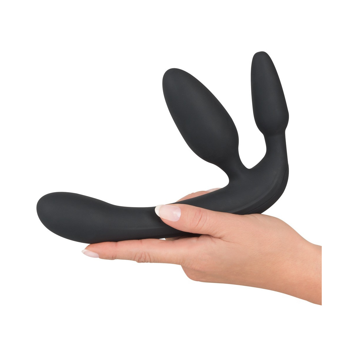 Trio penetrante con vibrazione per divertirsi da soli o in coppia! Sofisticato giocattolo triplo per giochi di ruolo di You2Toys, in cui la parte attiva è stimolata due volte, così come la parte passiva allo stesso tempo. Lei inserisce il vibratore vaginale e il plug anale e può poi godere del terzo vibratore. 7 modalità di vibrazione con 2 motori forniscono un divertimento vario e sono facilmente controllabili tramite il telecomando senza fili. Anche nella vasca da bagno o nella doccia, perché il trio è impermeabile e quando si viaggia, questo giocattolo è molto discreto grazie alla chiusura a chiave. Cavo di ricarica USB incluso. Lunghezza totale 20 cm, vibratore vaginale lungo 10 cm, plug anale lungo 8 cm, Ø max. 3,9 cm. Silicone, rivestimento in PU