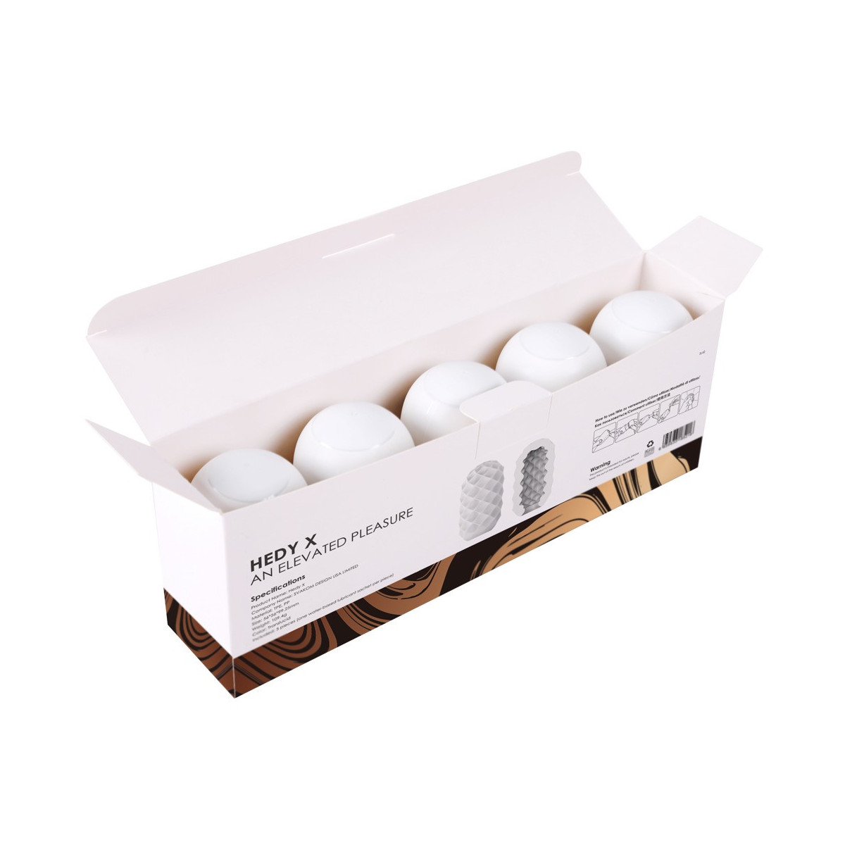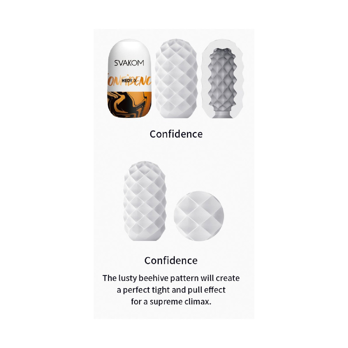 5 x Hedy X Confidence masturbatore rimovibile di Svakom, ciascuno nella pratica custodia a uovo che funge anche da distributore di lubrificante, stendino e deposito senza polvere. Il manicotto di masturbazione estremamente elastico e setoso si adatta perfettamente a qualsiasi dimensione del pene e può essere usato da 5 a 10 volte. La caratteristica struttura di stimolazione a diamante all'interno del manicotto fornisce un massaggio intenso ed efficace per l'orgasmo durante l'handjob.