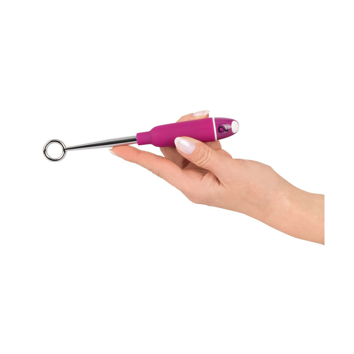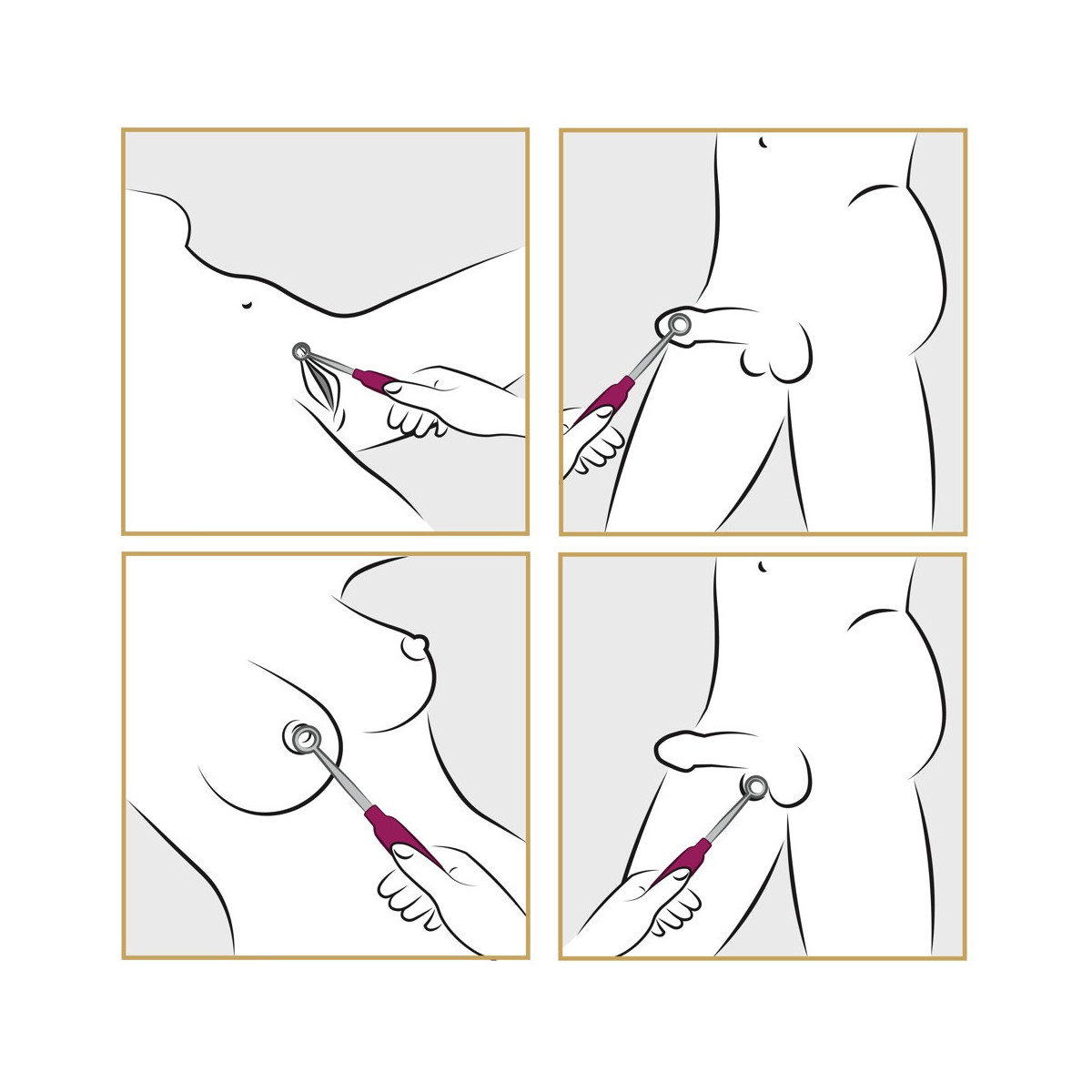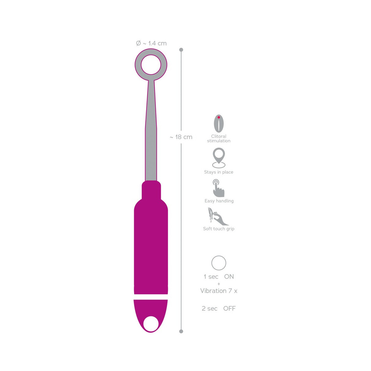 Questo vibratore clitorideo permette una precisa stimolazione del clitoride con 7 modalità di vibrazione. Il pratico comando a un solo pulsante semplifica l'operazione, mentre la morbida impugnatura vellutata appiattisce la mano. Le batterie sono incluse (3 x LR44). Lunghezza totale 17,9 cm, anello interno Ø 1,4 cm. Metallo, silicone con rivestimento in PU, AB