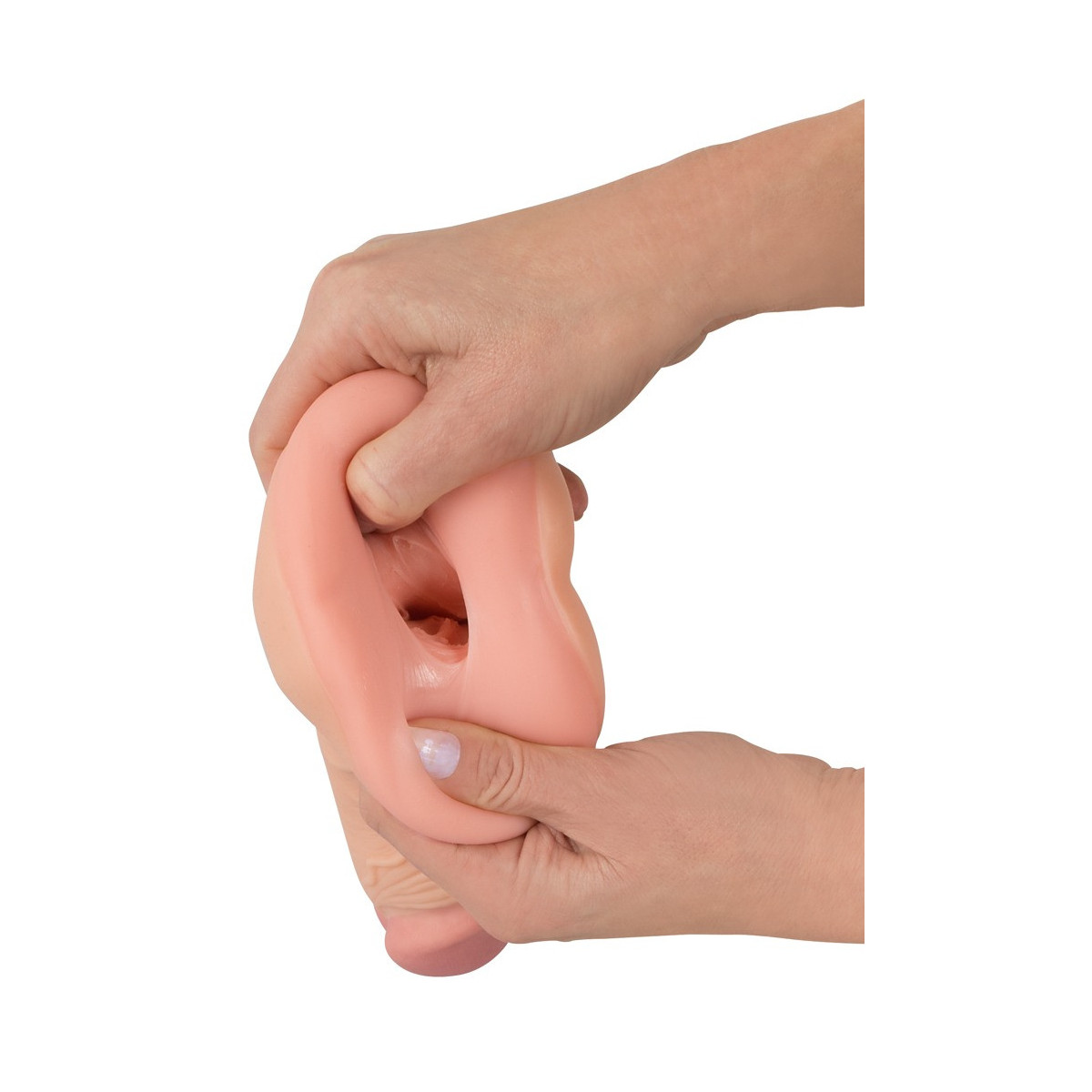 Lunghezza totale 21 cm, lunghezza di inserimento 16 cm, profondità di inserimento 13 cm. Esterno Ø 4,2-5 cm, interno Ø 1 cm, tutti molto elastici. Materiale simile alla pelle: Pelle naturale (TPE).