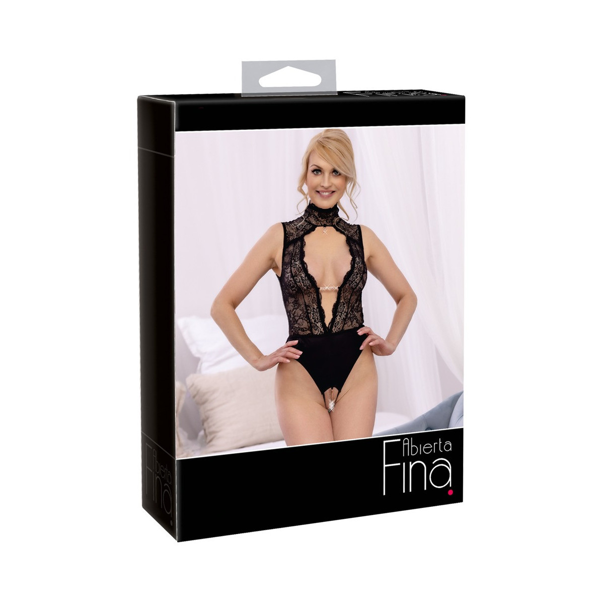 Sensazionale body di Abierta Fina in due pezzi realizzato in fine e morbido pizzo e nobile raso elasticizzato. Nonostante il colletto alto e ben abbottonato, il grande cut-out sul davanti e sul retro è incredibilmente provocante. Un piccolo ciondolo di strass sul colletto e una scintillante catena di strass sul davanti sono ulteriori elementi che attirano l'attenzione. Il cavallo completamente aperto è anche molto allettante, con una catena stimolante che può anche essere rimossa.