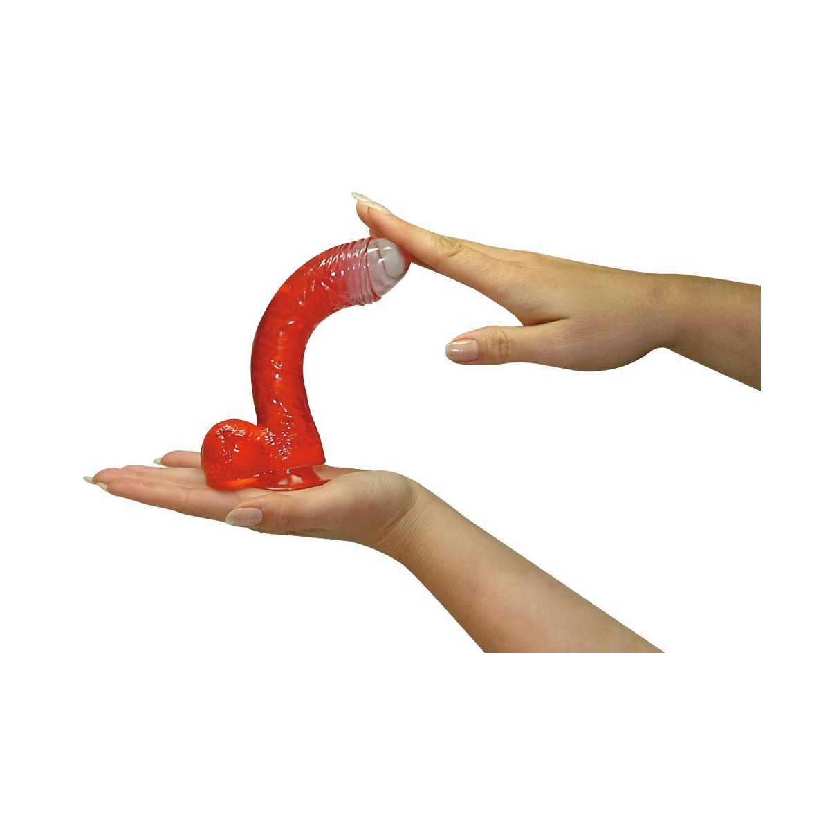 Dildo trasparente rosso flessibile con testicoli e piede a ventosa. Molto flessibile. 17 cm, Ø 3-3,5 cm. Materiale: PVC.