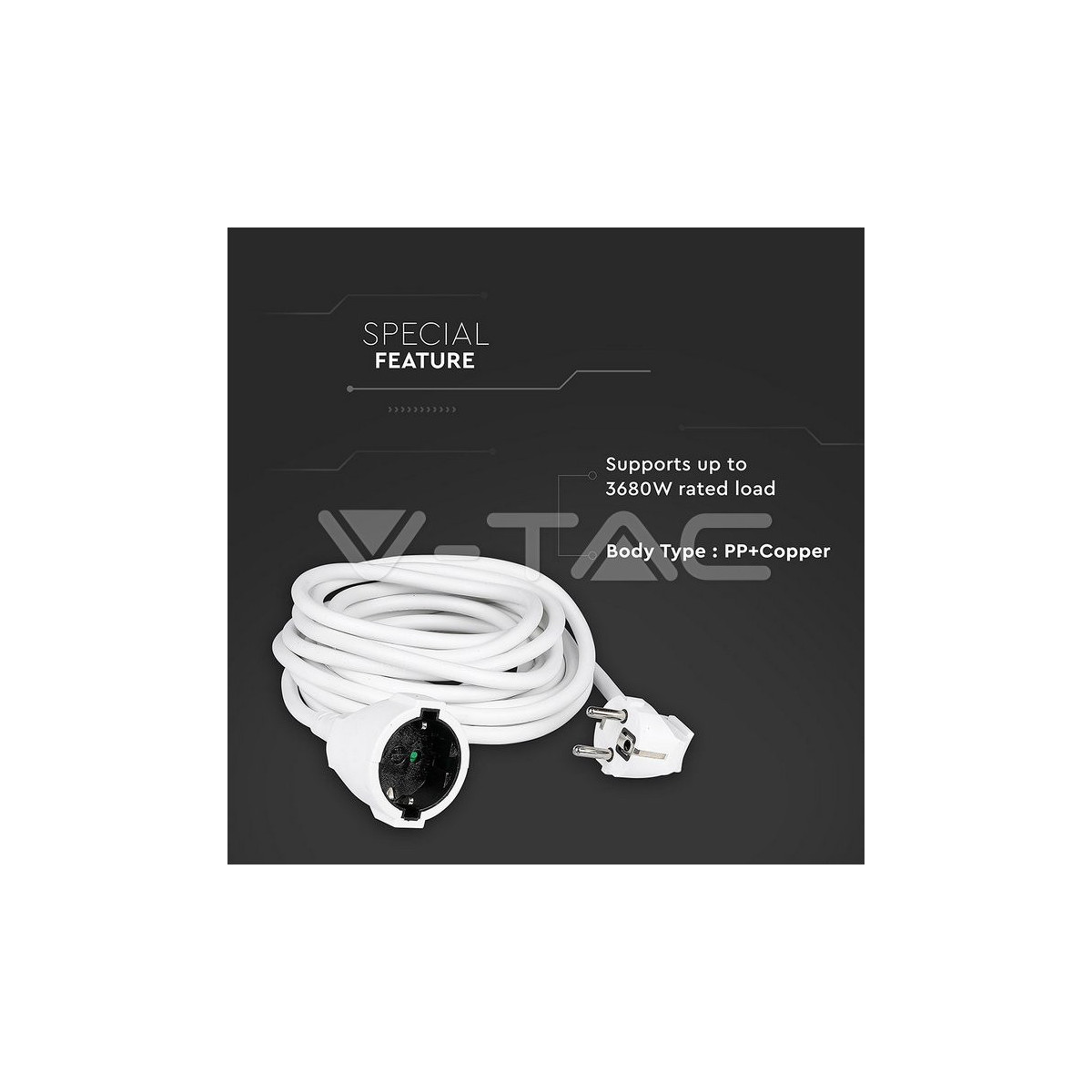 V-TAC VT-3001. Lunghezza cavo: 5 m, Quantità prese AC: 1 presa(e) AC, Posizionamento supportato: Interno/esterno. Tensione di ingresso AC: 250 V, Frequenza di ingresso AC: 50/60 Hz, Massima potenza in entrata: 3680 W. Peso: 660 g. Numero di prodotti inclusi: 1 pz