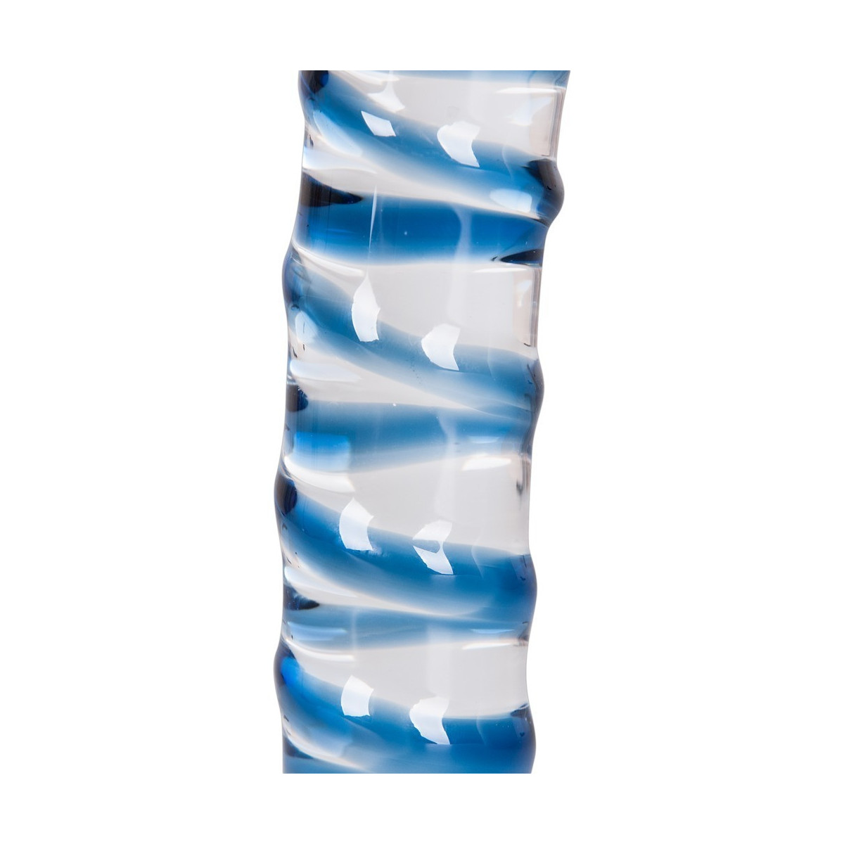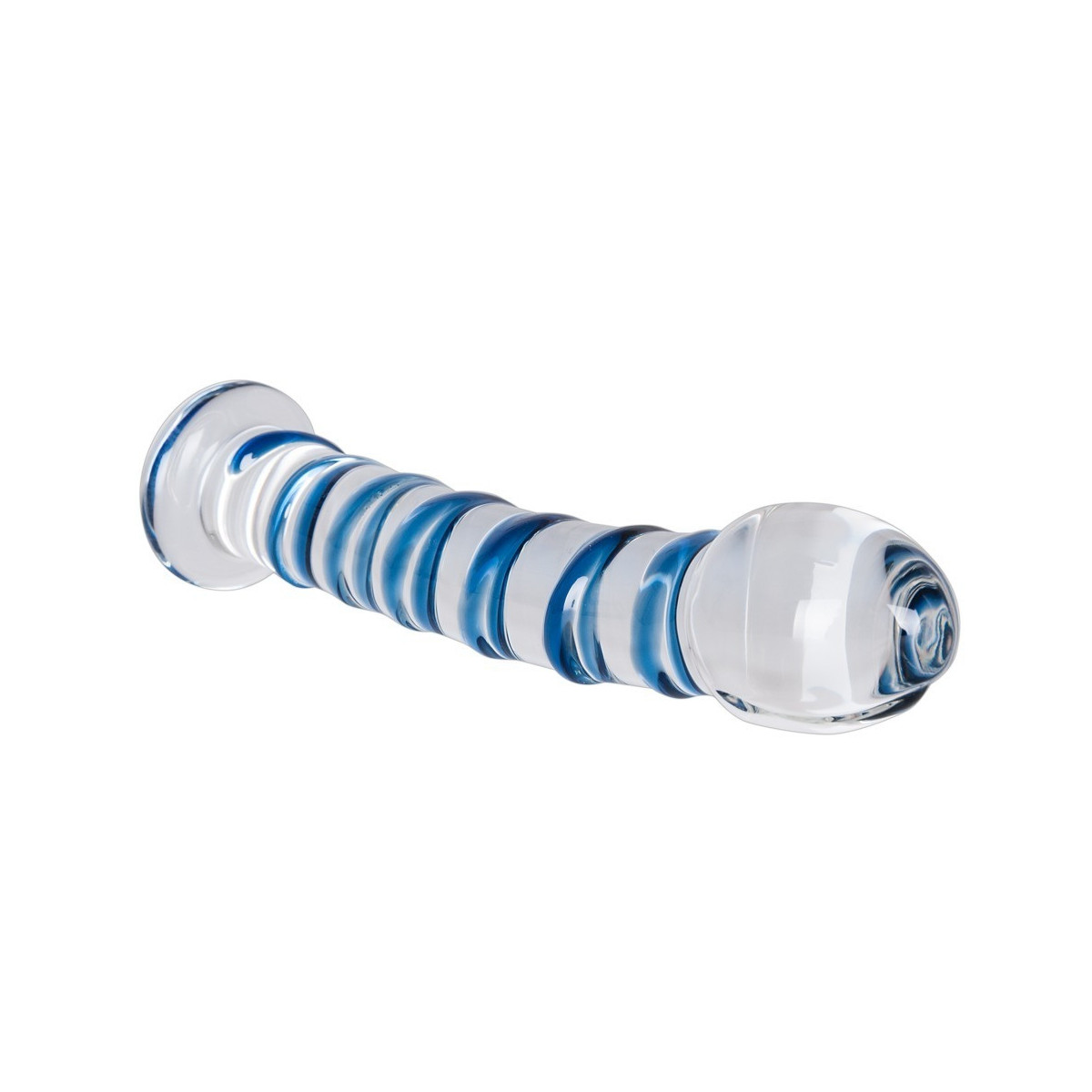 Dildo leggermente curvo in vetro di qualità trasparente con spirale di stimolazione blu in rilievo sul fusto e sulla base. Lunghezza 18 cm, profondità di inserimento ca. 16,5 cm, Ø da 2,5 a 3,5 cm. Peso: 224 g. Materiale: vetro. Compresa la borsa nera vellutata con coulisse.