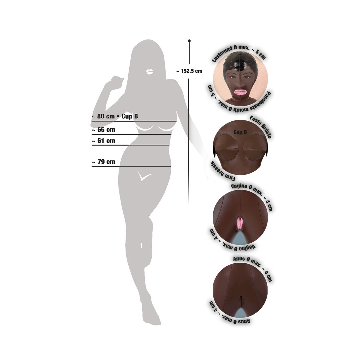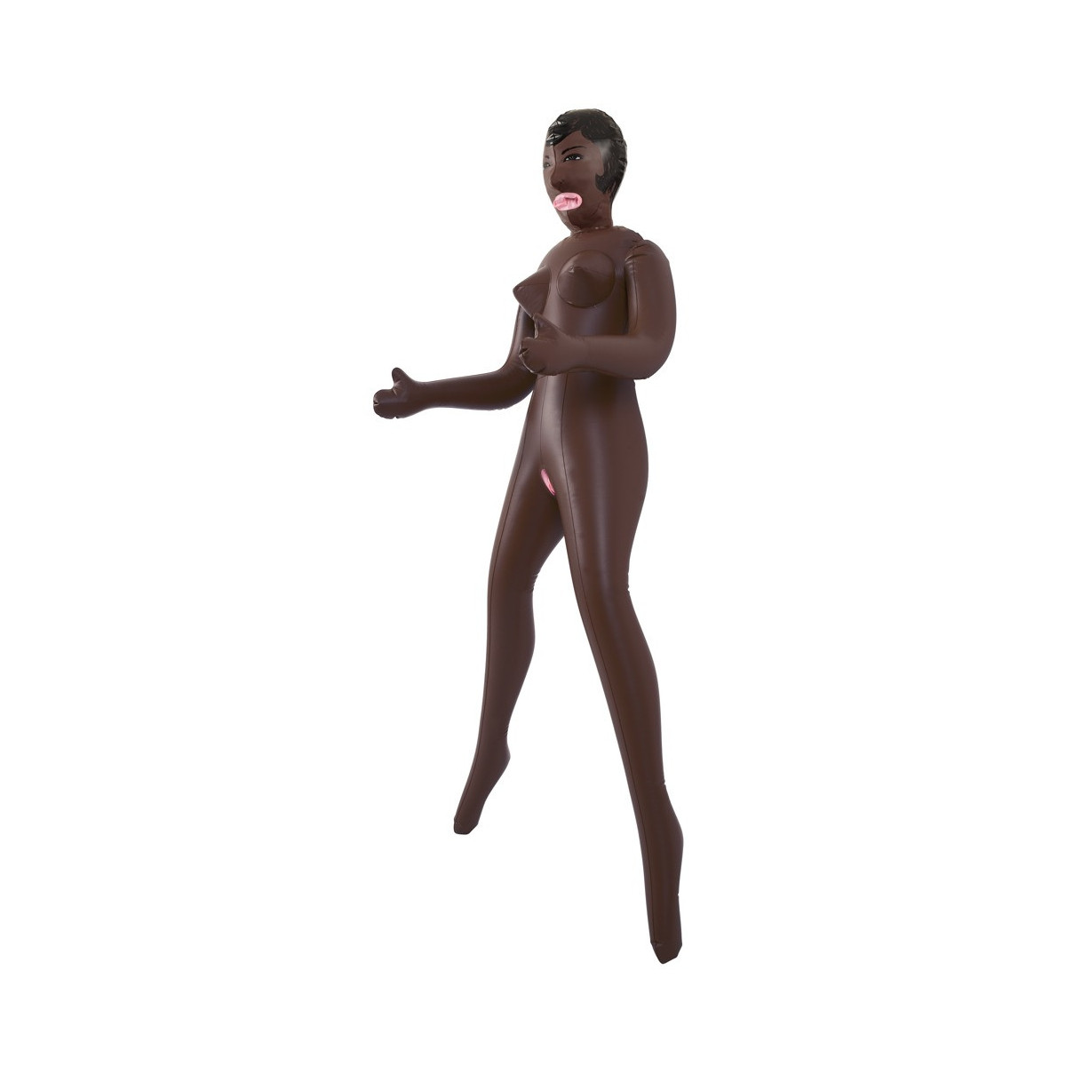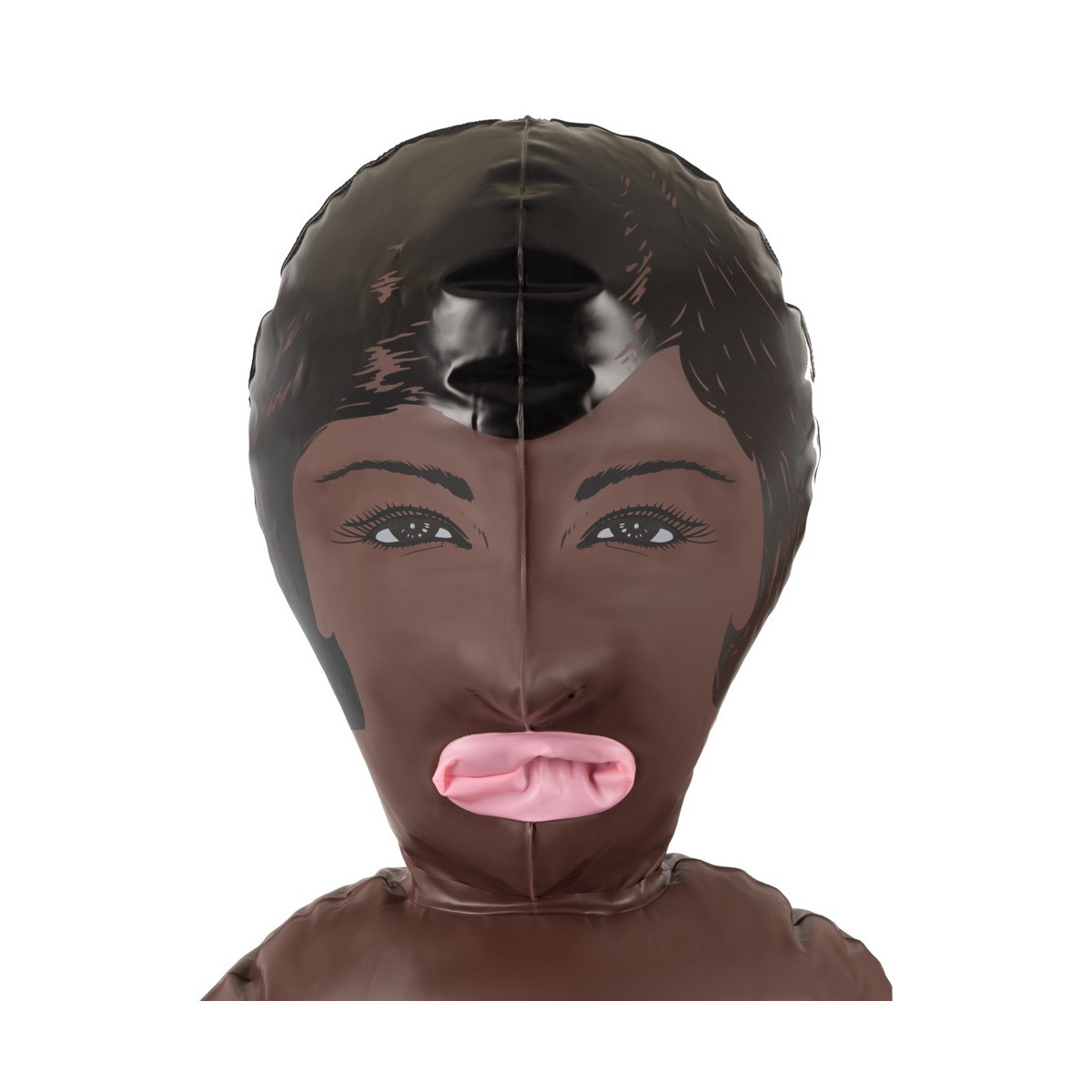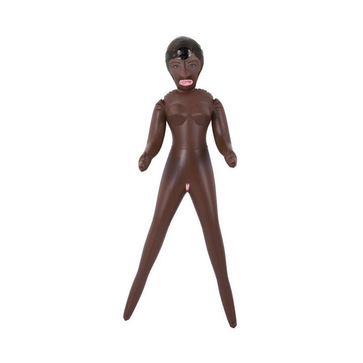 Ragazza esotica dagli occhi scuri con tre aperture del piacere (bocca, vagina, ano), viso e capelli sono stampati. Bambola gonfiabile ad altezza uomo. Materiale: PVC.