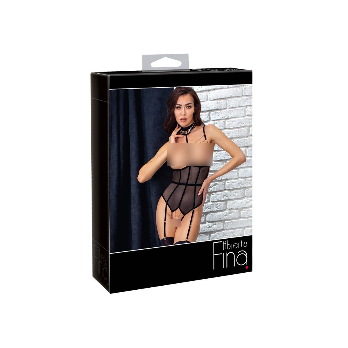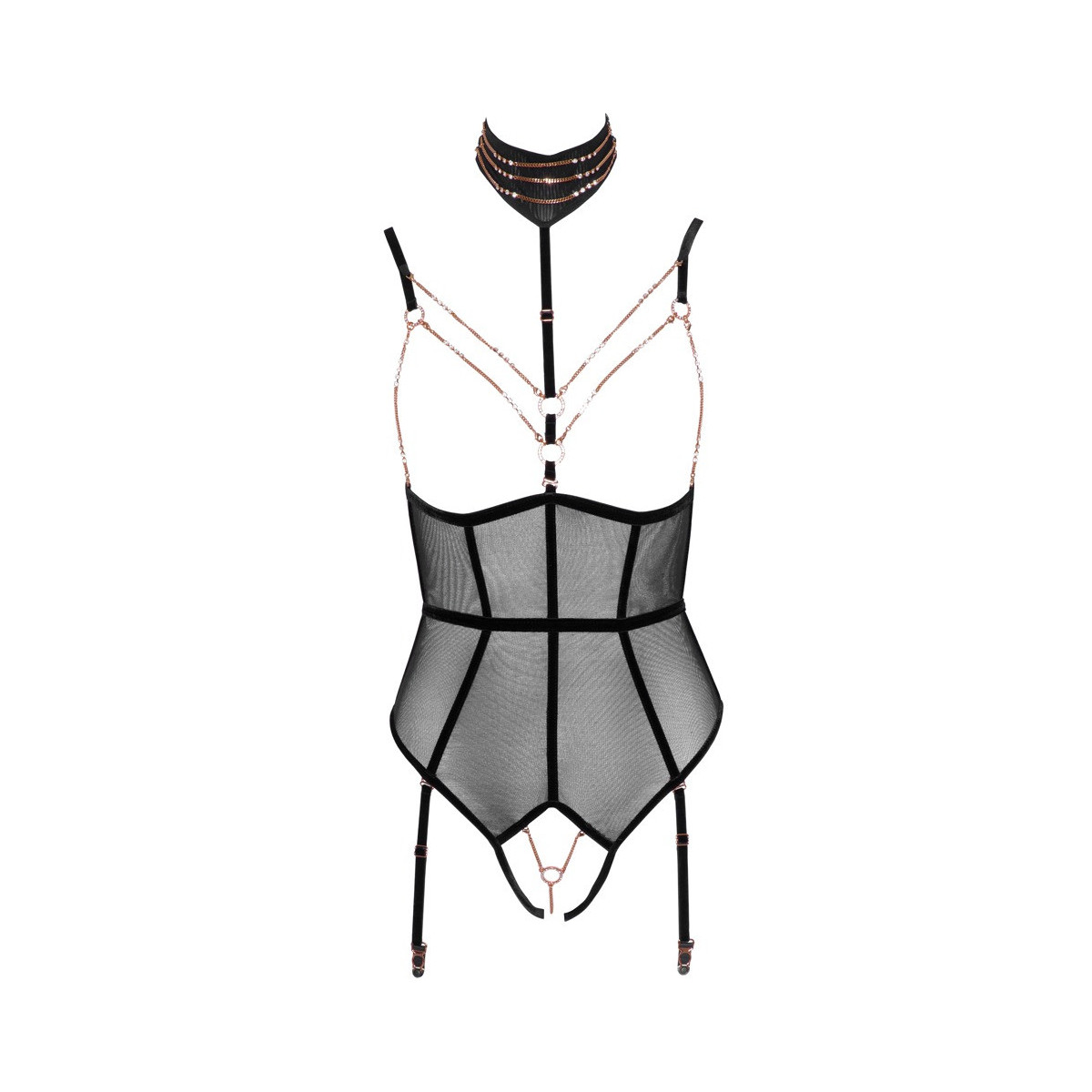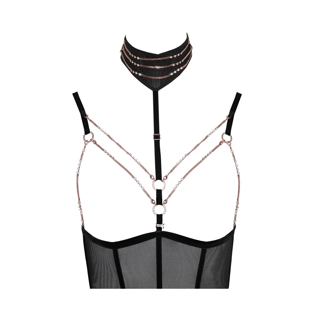 Body senza seno di Abierta Fina con cavallo completamente aperto in powernet con strisce di velluto elastico ed elementi di gioielleria color oro rosa. Cinghie e bretelle regolabili, bretelle anche rimovibili. Cinghia regolabile del dècolletè con collana ornata di catene (con chiusura a bottone) anch'essa rimovibile, come le catene del seno con piccoli moschettoni e la catena inguinale con anello decorativo. Tutte le catene sono inoltre decorate con piccoli strass. Vista posteriore in look a due pezzi con due chiusure a clip su reggiseno e mutandine/cintura in vita.