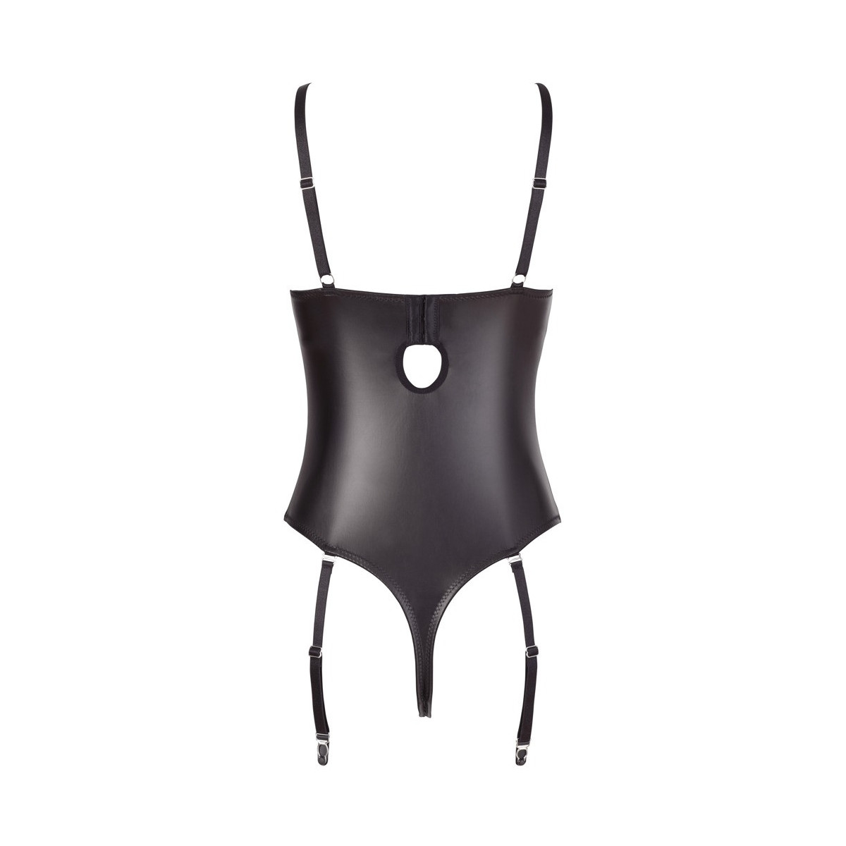 Sensuale corpo a stringhe con bretelle regolabili e rimovibili e un tacco leggermente foderato con ferretto con chiusura a gancio nella parte posteriore. Con sofisticati dettagli del cinturino e un elaborato elemento di strass nel décolleté. L'inserto in pizzo semitrasparente sul davanti offre spunti lascivi. In cima ci sono ulteriori sofisticate allacciature con anelli d'argento ed elastici. Il cavallo è completamente aperto. Come nel décolleté, ci sono emozionanti dettagli del cinturino e un altro elemento di strass.
