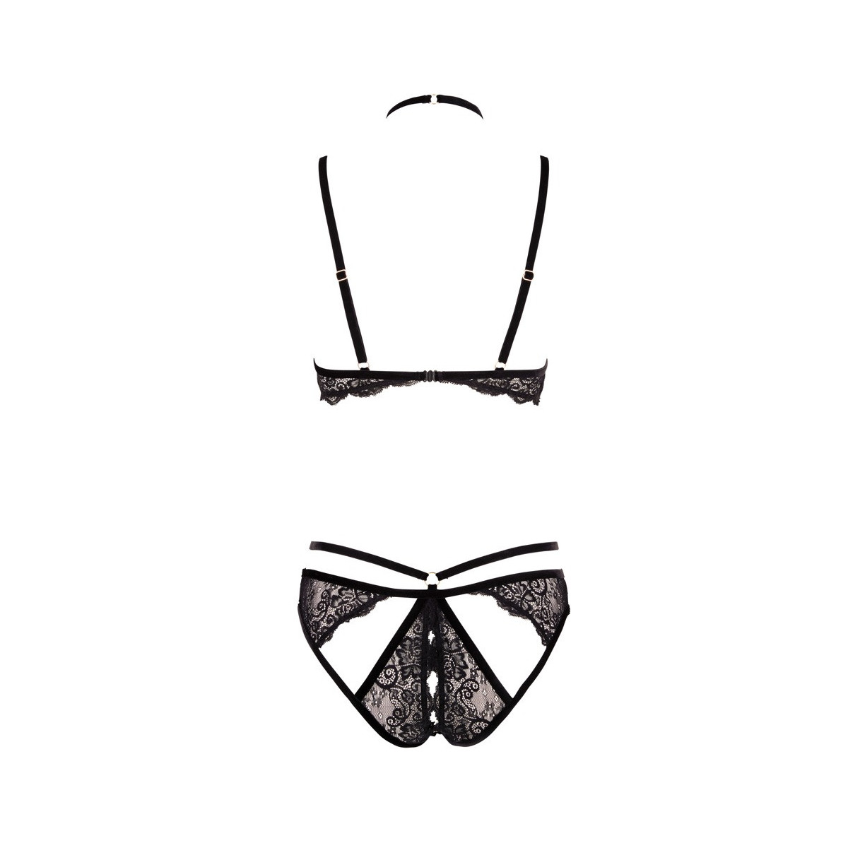 Il corpo nero permette di guardare in profondità, perché è costituito quasi esclusivamente da cinghie di velluto, che conferiscono alle curve una cornice elegante e sono regolabili per un comfort ottimale. Il busto è incorniciato da coppe aperte in delicato pizzo e le mutandine senza cavallo hanno anche inserti in pizzo. Inoltre, molti dettagli color oro adornano il corpo, come gli anelli di strass sul collo e le mutandine. 90% poliammide, 10% elastan.