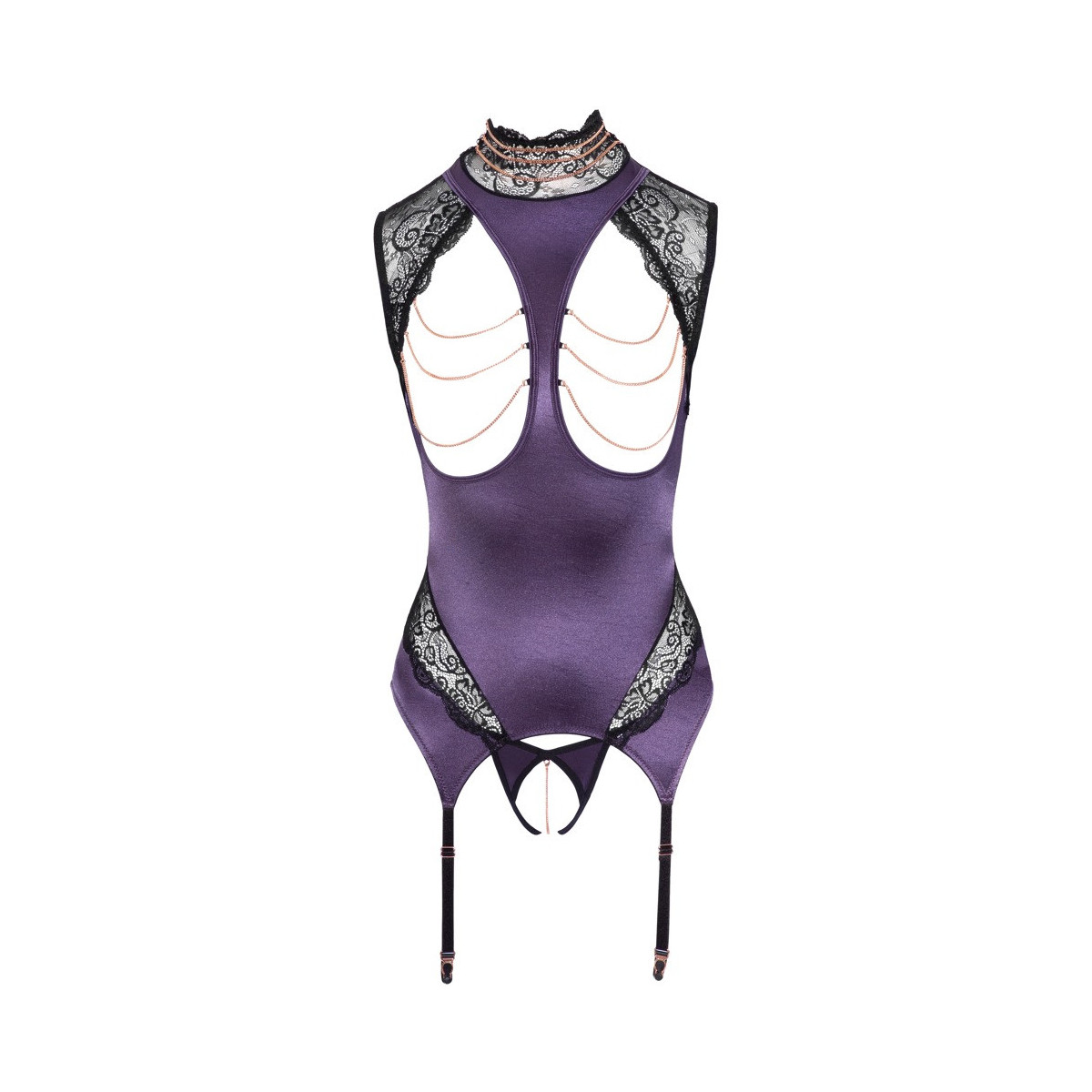 Chemise con busto e reggicalze senza schiena di Abierta Fina in raso viola elastico con fini inserti in pizzo nero e colletto in pizzo con chiusura a 2 bottoni. Scollo davanti decorato con 3 catene. Il busto libero e la schiena sono anche decorati con catene color oro rosa, tutte rimovibili grazie a piccoli moschettoni. Sul retro, la chemise con bretelle ha una chiusura a gancio. Le reggicalze sono regolabili in lunghezza. Il perizoma abbinato ha un invitante cavallo aperto con una stimolante catena al cavallo che è anche rimovibile.
