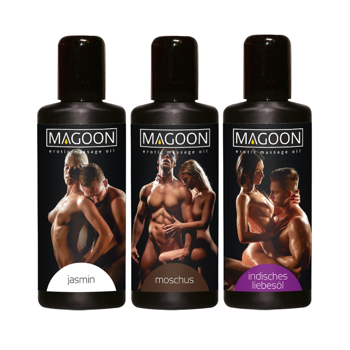 La splendida idea regalo per viziare se stessi oppure come pensierino per il vostro tesoro o i cari amici. Olio per massaggio MAGOON trasforma qualsiasi massaggio del partner e qualsiasi preliminare in una festa dei sensi! Pregiata qualità made in Germany Componenti pregiati curano la pelle delicatamente per un piacere del massaggio ultra-lungo. Solubile in acqua e lavabile. Tre oli per massaggi erotici nel conveniente Set - rispettivamente flacone a 50-ml »Muschio«, »Olio d‘amore indiano« e »Gelsomino«.