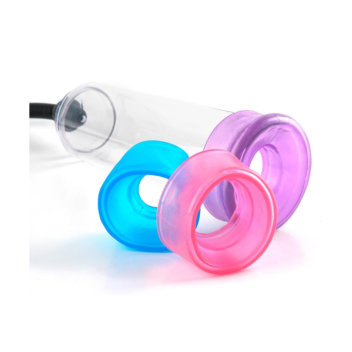 Pompa per pene trasparente con impugnatura a due dita e valvola di sicurezza. La superficie strutturata del cilindro fornisce una presa antiscivolo. Per tutti gli uomini che vogliono un efficace addestramento alla potenza. Con una stimolazione piacevolmente succhiante - simile a un pompino. I 3 polsini chiusi hanno diametri diversi e consentono quindi un'esperienza individuale.
