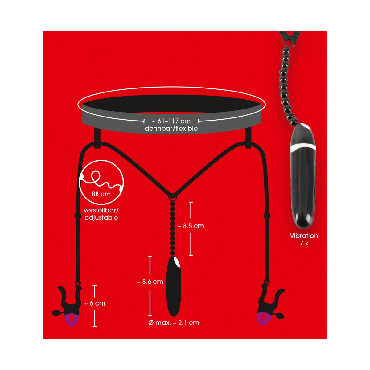 Circonferenza dell'anca di almeno 61 cm, estensibile fino a circa 177 cm. Fascia di fissaggio lunga circa 11 cm ciascuna (regolabile più corta), banda perlata lunga 8,5 cm. Lunghezza totale del vibratore 8,6 cm, Ø 1,8-2,1 cm. PET, poliammide, elastan, ferro, ABS, silicone, plastica PC, acciaio al carbonio, acrilico.