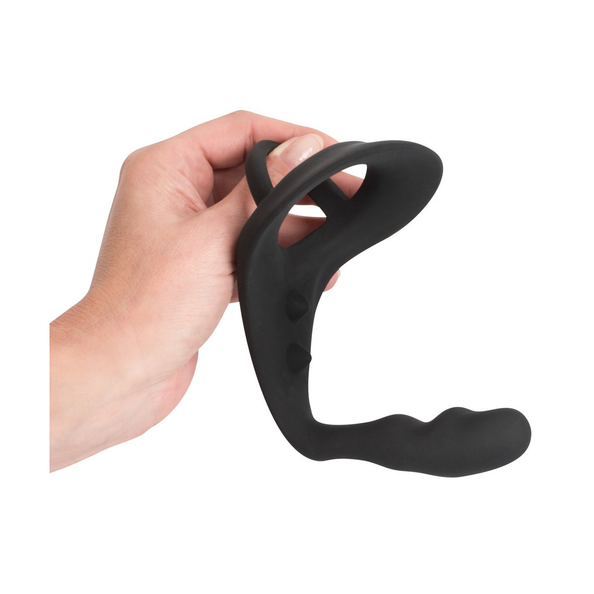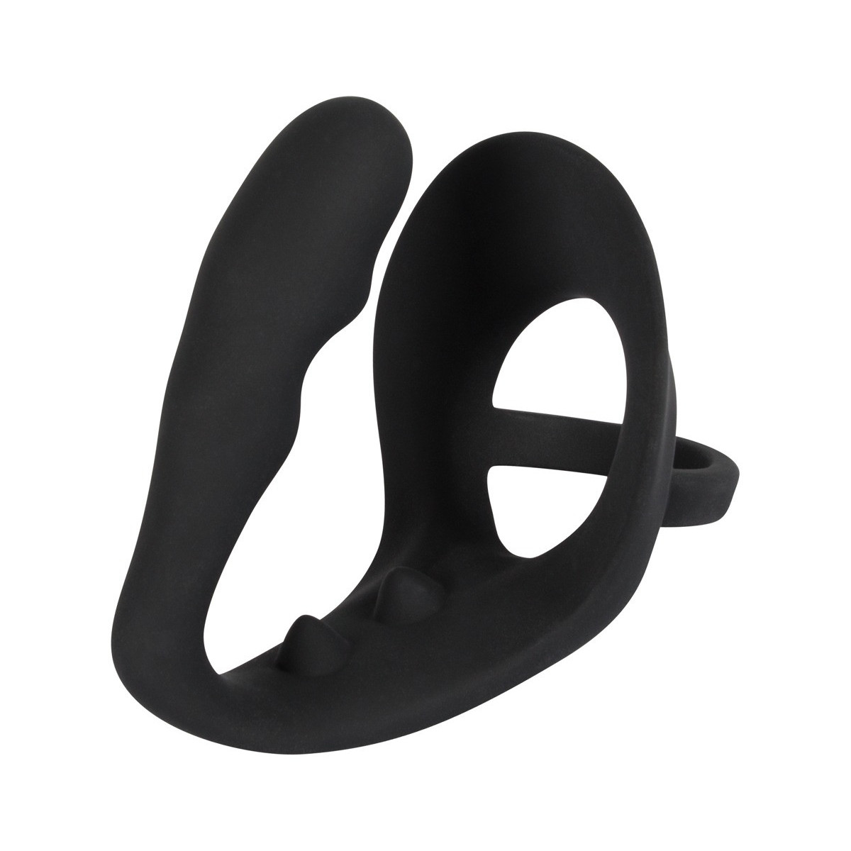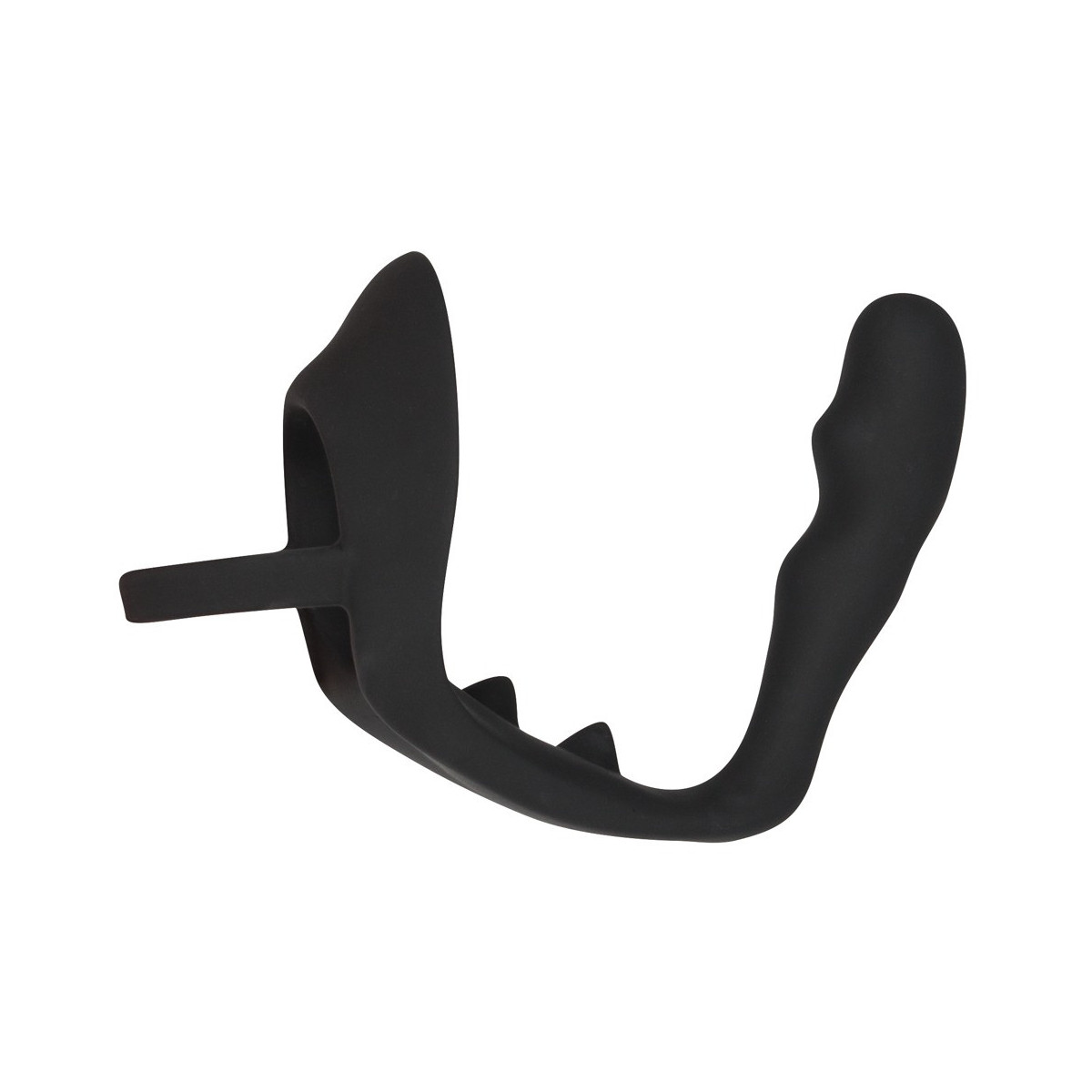 Questo anello nero per pene e scroto non solo è dotato di un plug anale aggiuntivo, ma anche di un ponte per il perineo deliziosamente nodoso. Piacere puro!