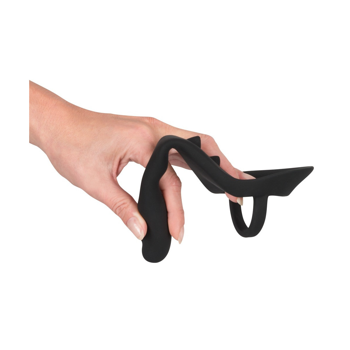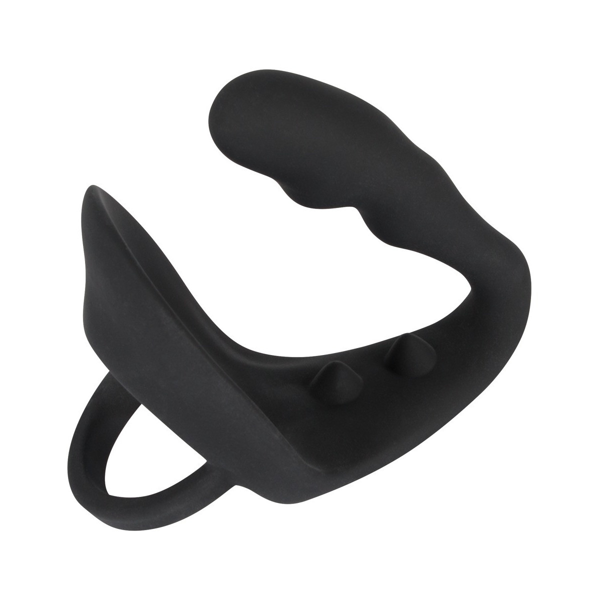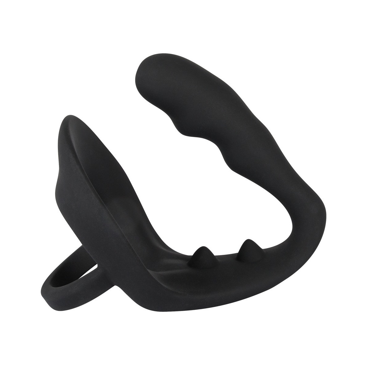 Questo anello nero per pene e scroto non solo è dotato di un plug anale aggiuntivo, ma anche di un ponte per il perineo deliziosamente nodoso. Piacere puro!