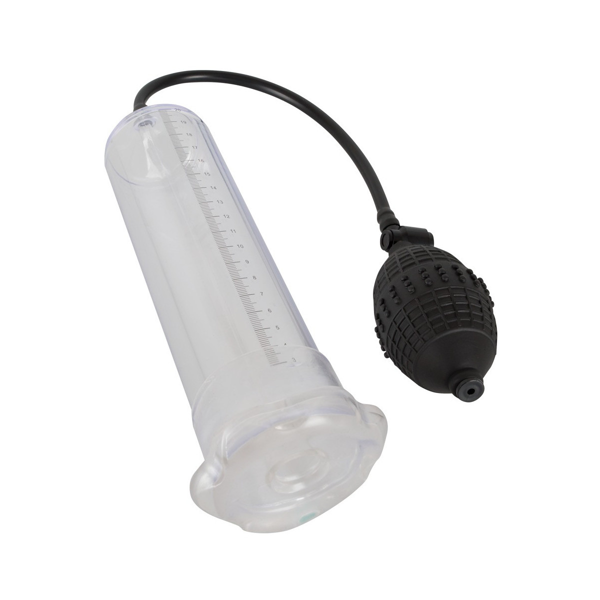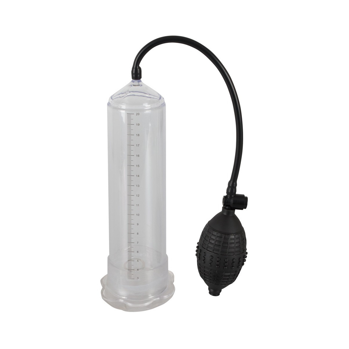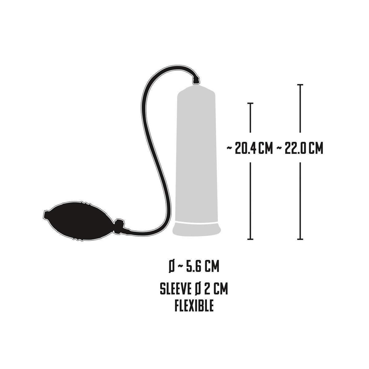 Pompa per il pene trasparente con polsino attaccato (Ø 2 cm estensibile) e pratica pompa a sfera. Il successo dell'ingrandimento può essere letto dalla scala di misura. Con valvola di sicurezza. Cilindro lungo circa 22 cm, Ø 5,6 cm. ABS, TPE (polsino), PVC (pompa a sfera).