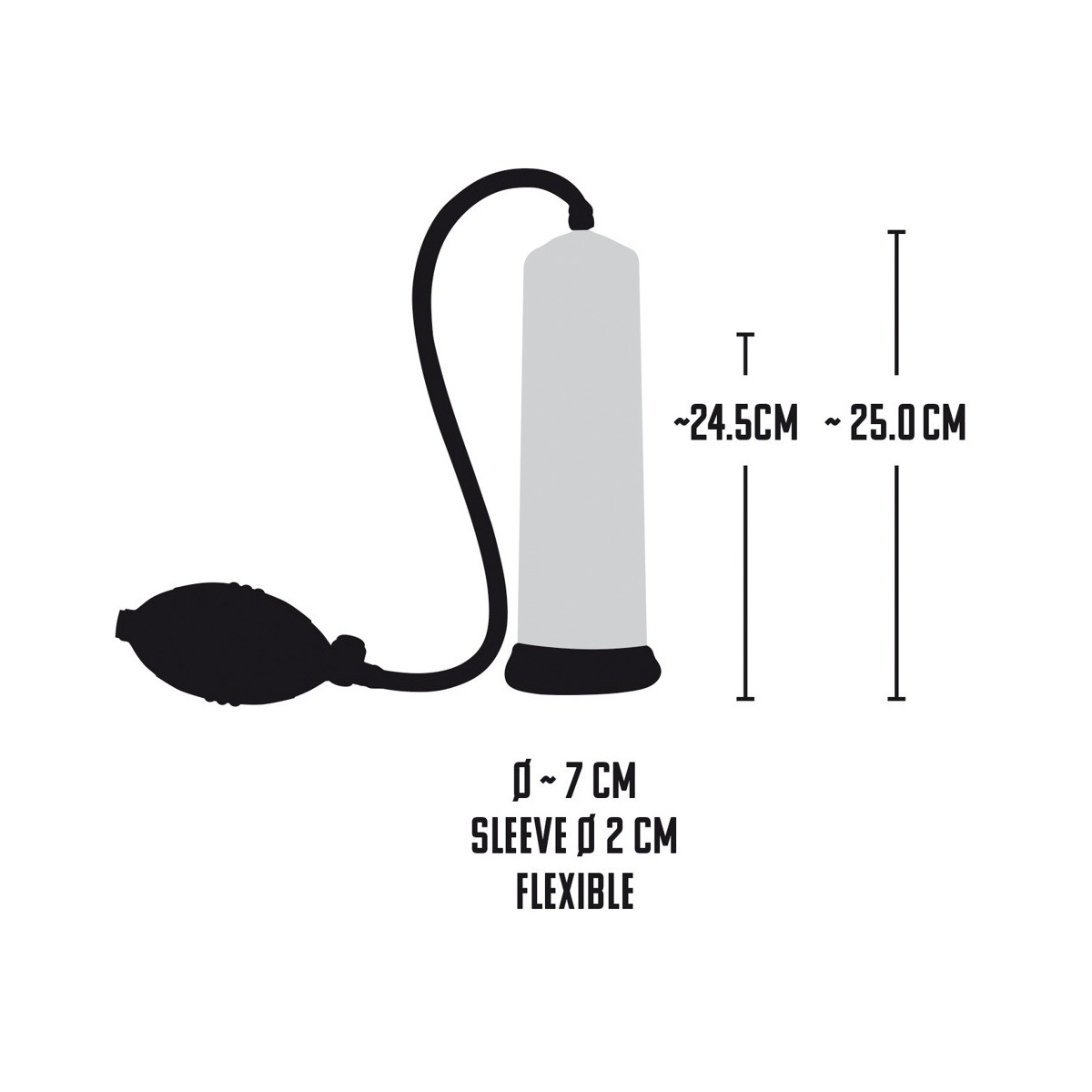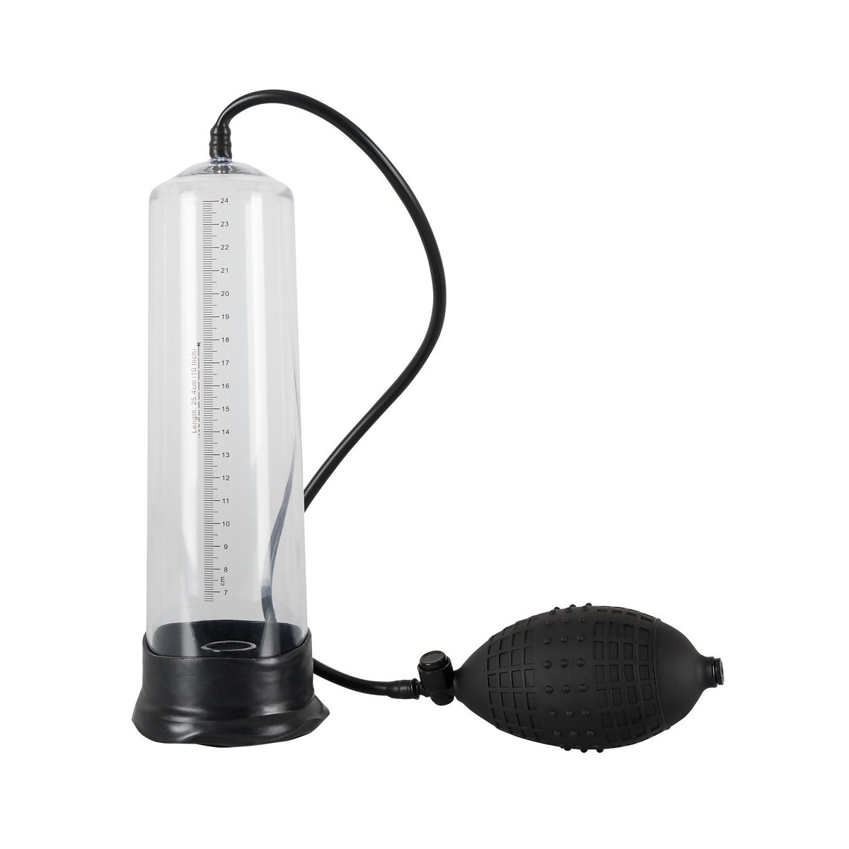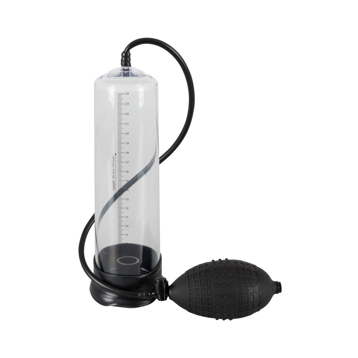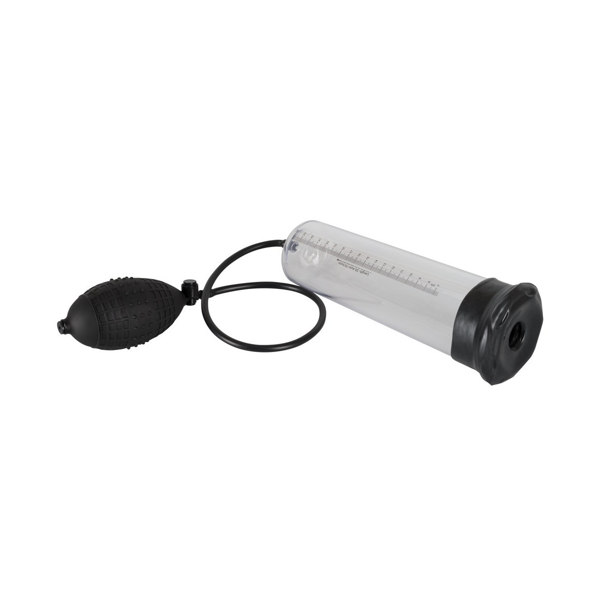 Il pene lubrificato viene inserito nel cilindro trasparente e chiuso saldamente alla radice dalla cuffia in silicone morbido. Con la comoda pompa con valvola di scarico integrata si crea il vuoto e il cilindro trasparente con la scala di misurazione mostra le rispettive dimensioni del pene.