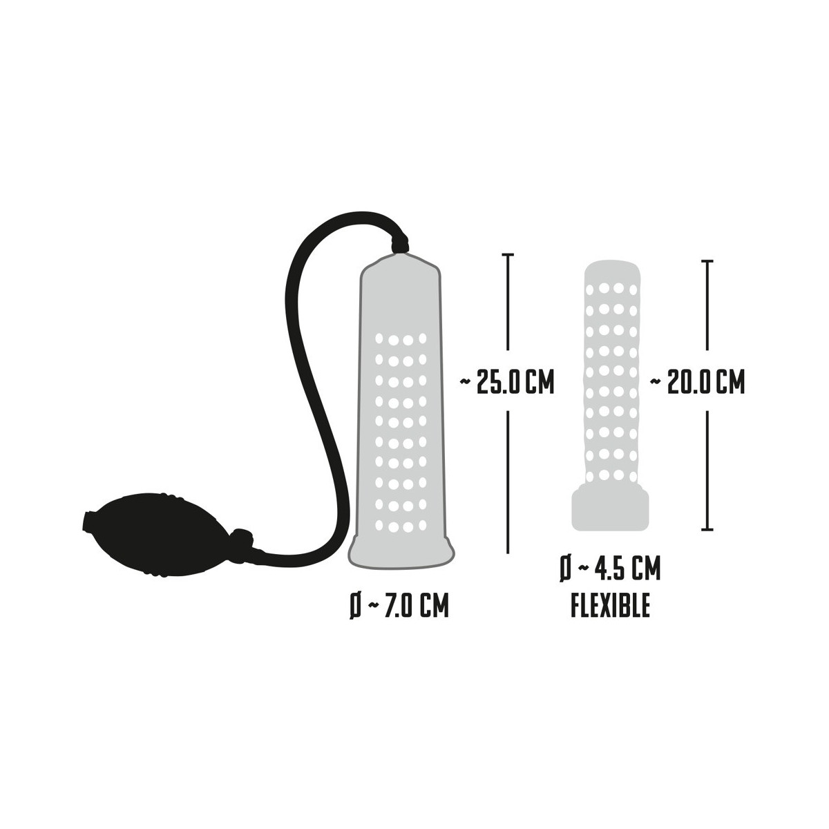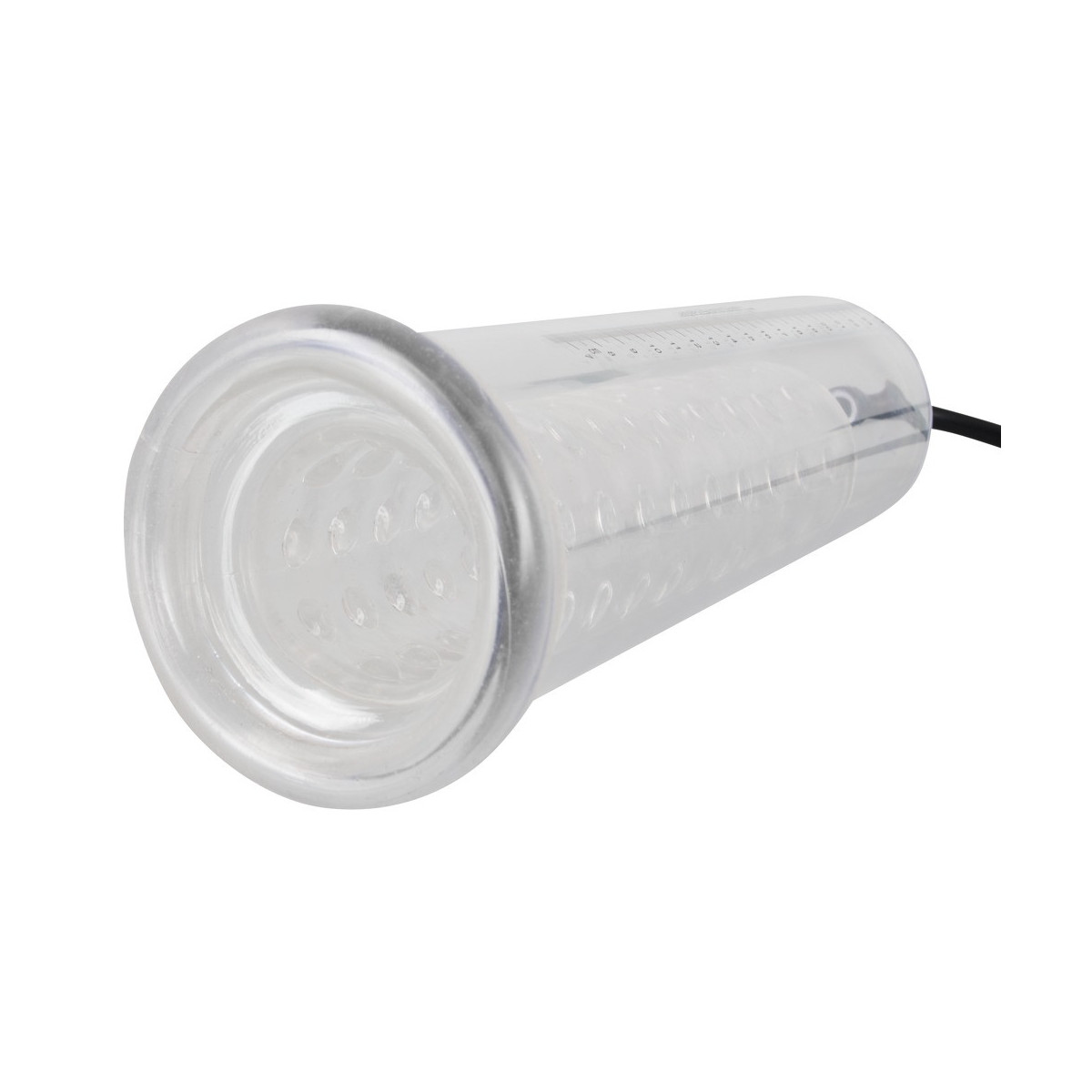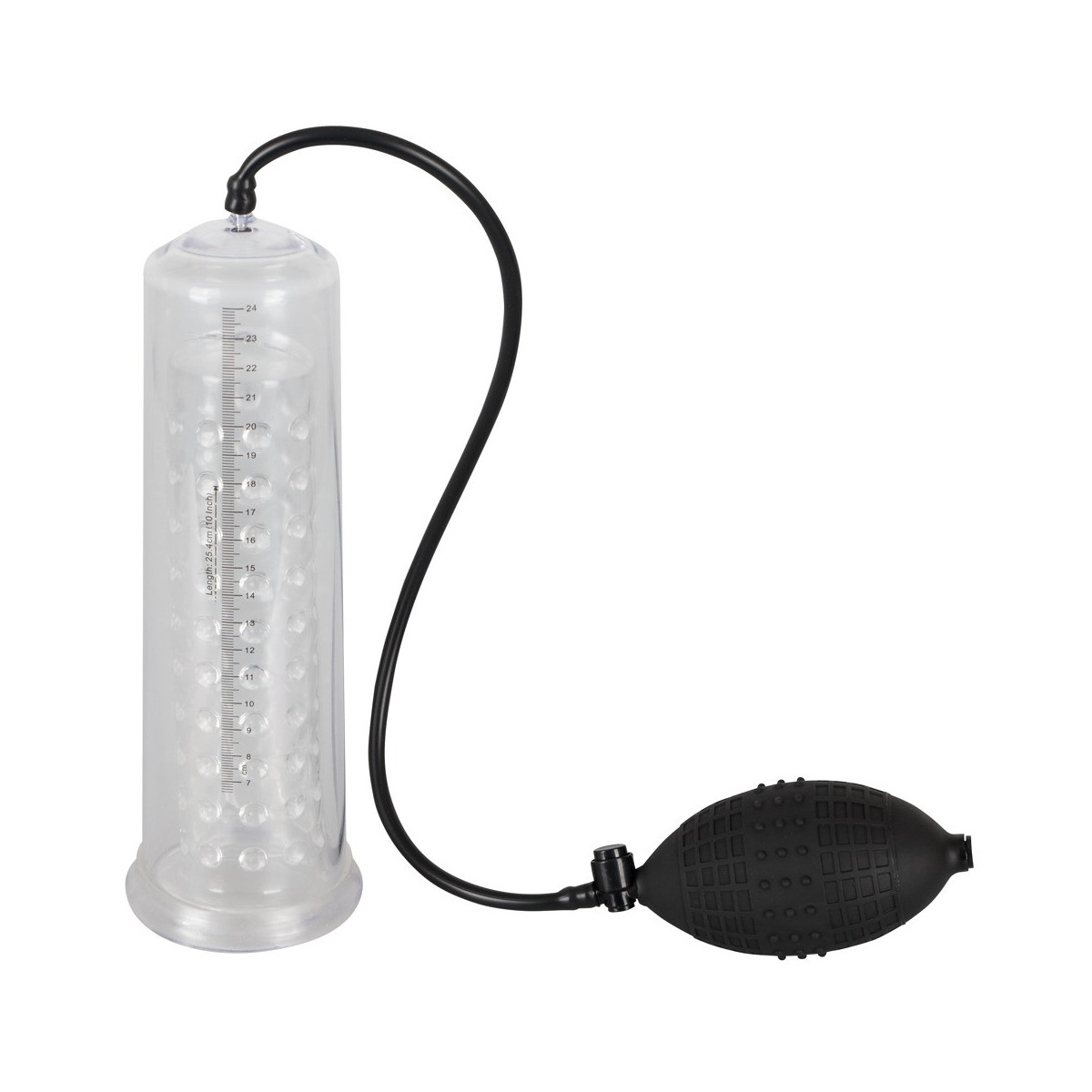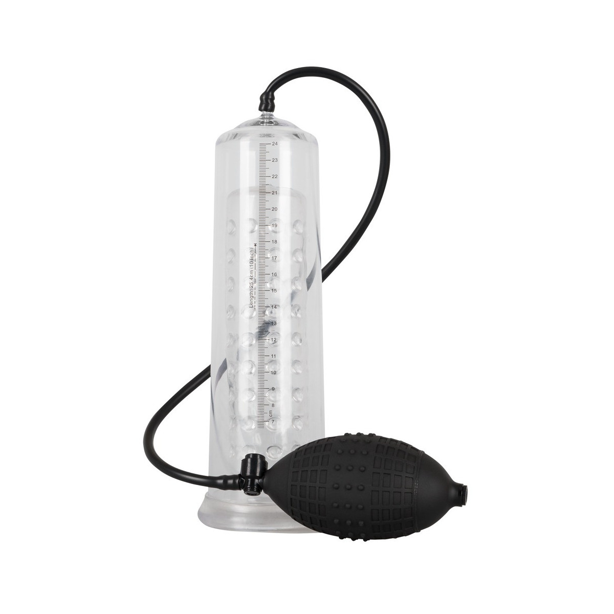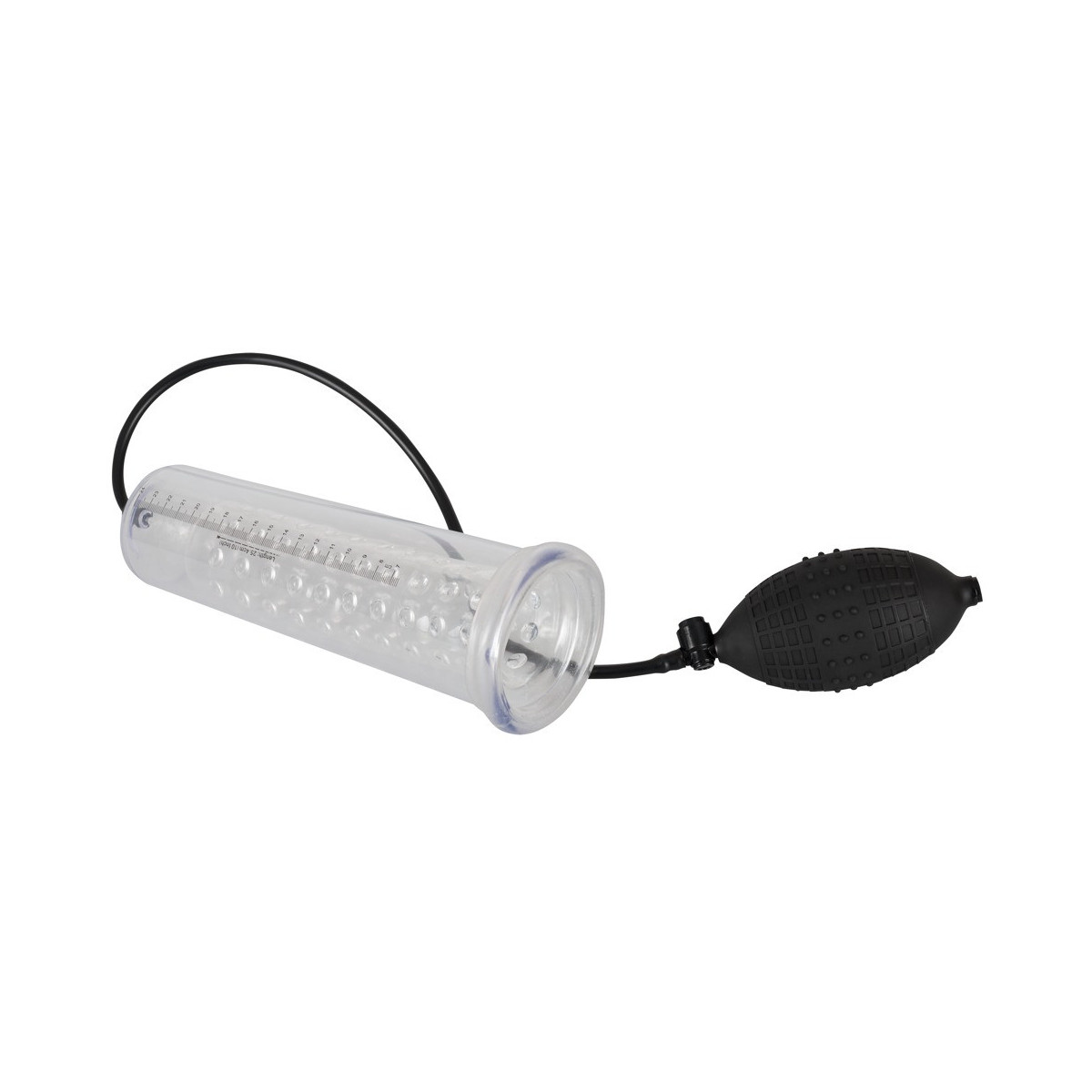 Il pene lubrificato viene inserito nel cilindro trasparente e chiuso saldamente alla radice dalla guaina di silicone morbido. Con la comoda pompa con valvola di rilascio integrata si crea il vuoto e il cilindro trasparente con la scala di misurazione mostra le rispettive dimensioni del pene. Inoltre, il pene viene stimolato con un manicotto di silicone trasparente con delle ghiere.