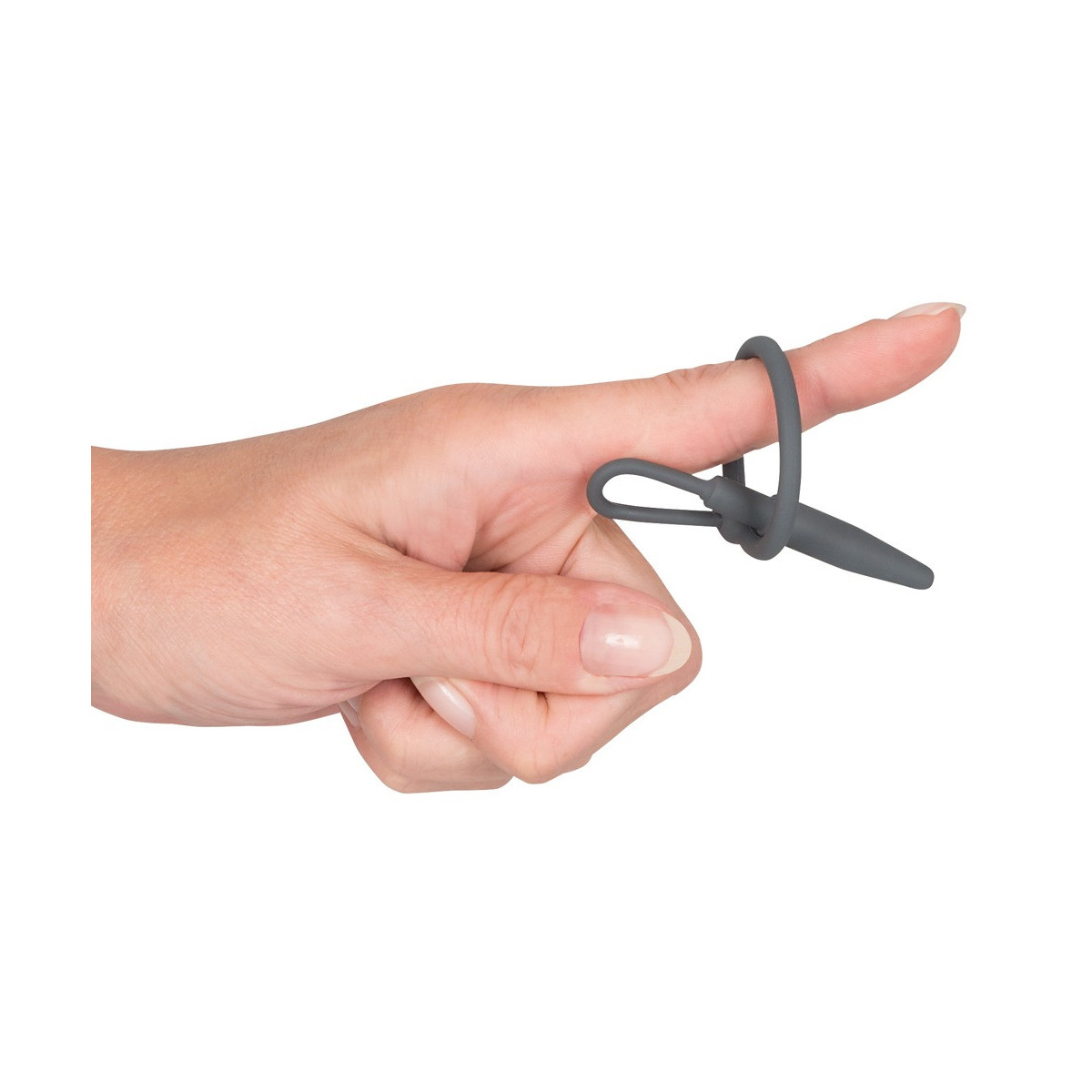 Mettere l'anello intorno al glande e inserire il dilatatore nell'uretra! Godetevi l'emozionante sensazione di un glande abbracciato e il dilatatore inserito nella zona intima sensibile dell'uretra... Lunghezza totale del dilatatore 6,2 cm, profondità di inserimento ca. 4,5 cm. Ø 0,3-0,8 cm. Anello interno Ø 3 cm (molto flessibile). Materiale: silicone con rivestimento in poliuretano.