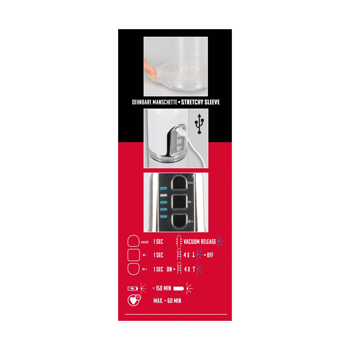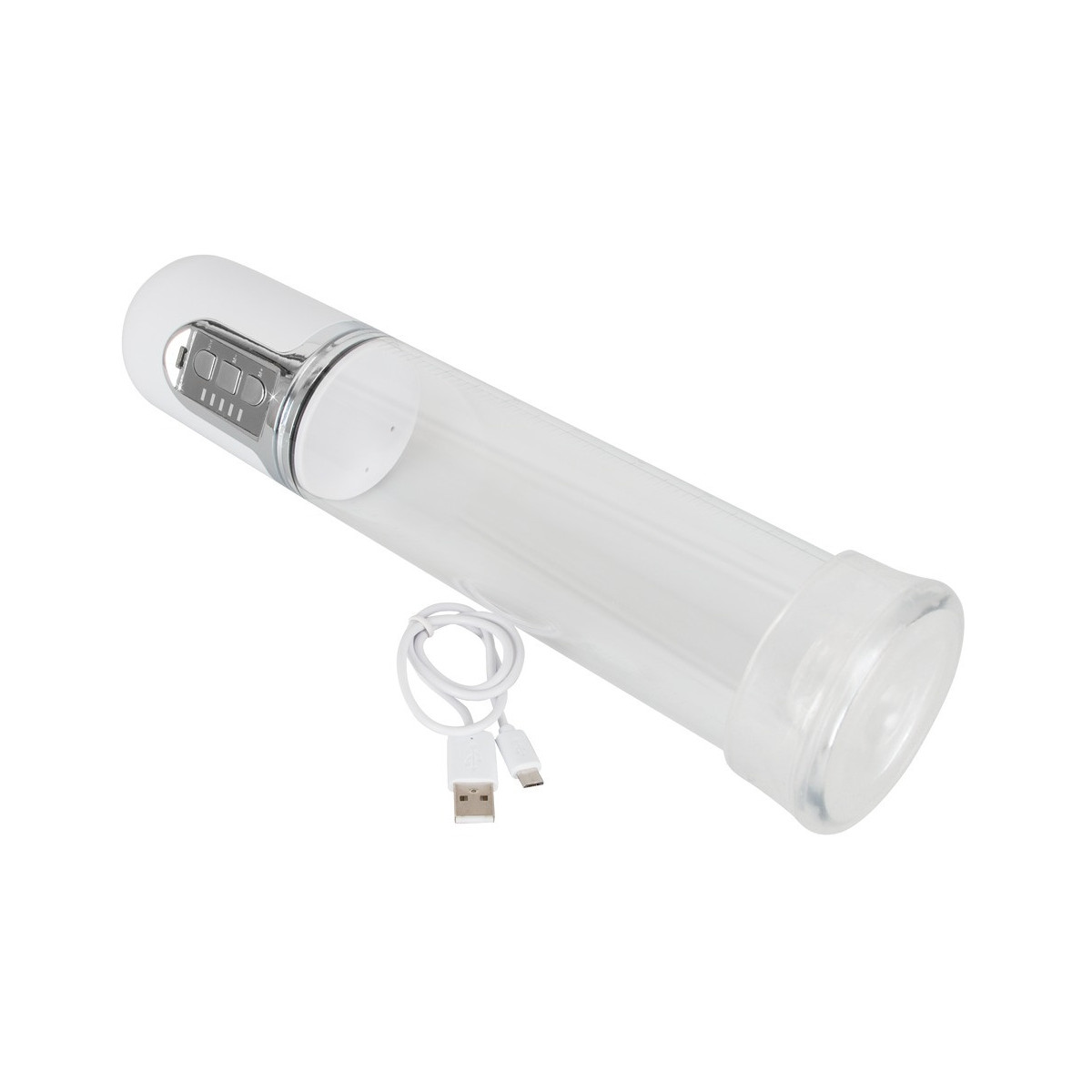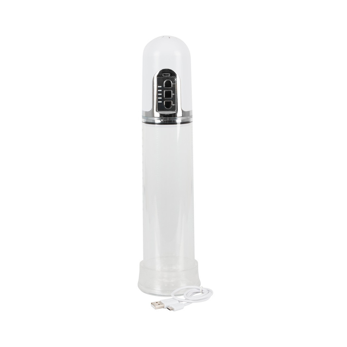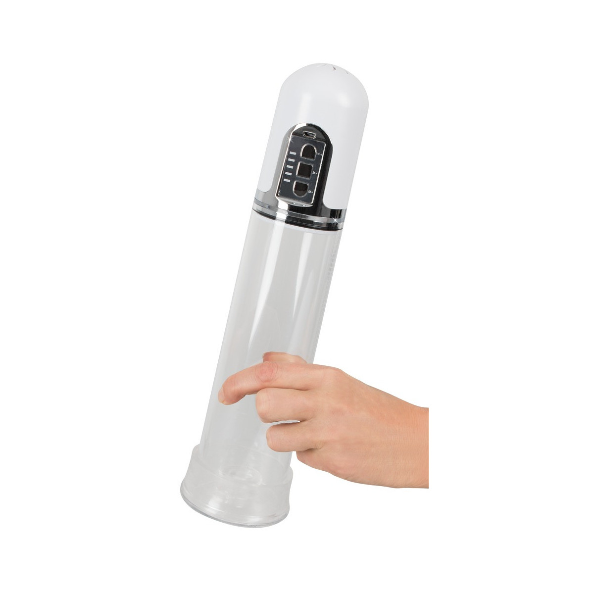 Il pene lubrificato viene inserito nel cilindro trasparente e chiuso saldamente alla radice dalla cuffia in silicone morbido. Premendo un pulsante si crea un vuoto e il cilindro trasparente con la scala di misurazione mostra le rispettive dimensioni del pene. Con cavo di ricarica USB.