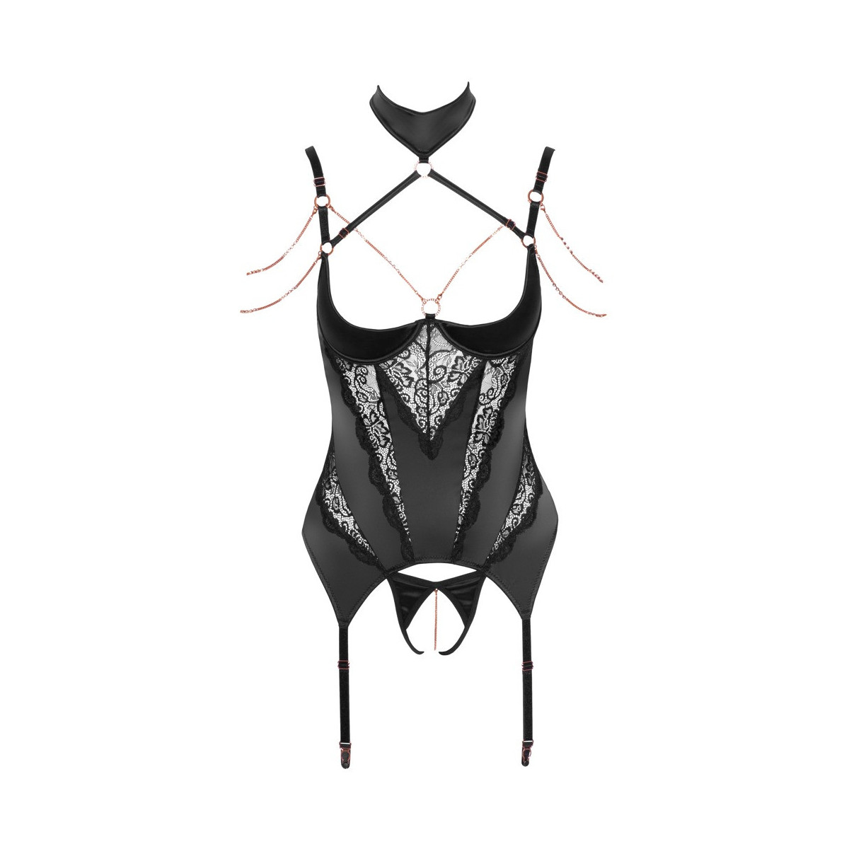 Sensazionale chemise con reggicalze di Abierta Fina in raso elastico, con inserti di pizzo che guidano la silhouette sul davanti e guarniti con elementi di gioielleria color oro rosa. Il ferretto incorporato con coppe leggermente imbottite mette il busto in ottima forma e direttamente sotto i riflettori. Le due spalline regolabili del décolleté che portano dalle spalline regolabili al collare con chiusura in velcro sono sofisticate. Le catene decorative con strass sul petto e sulle spalle sono dotate di piccoli moschettoni e sono quindi rimovibili. Nella parte posteriore con chiusura a gancio. Le giarrettiere sono regolabili in lunghezza. Il piccolo perizoma ouvert in raso elastico con la catena staccabile nel cavallo aperto è incluso.