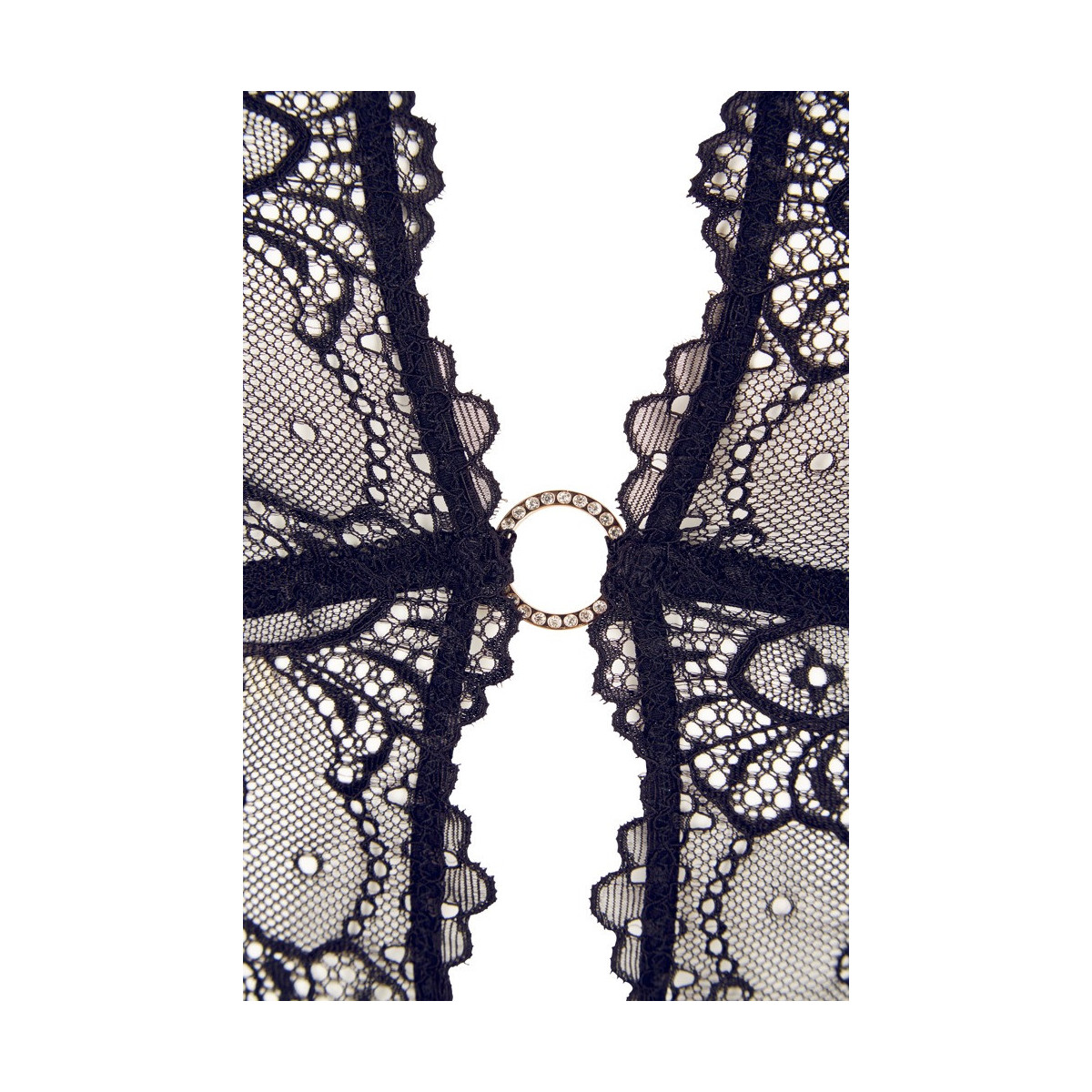 La chemise nera con reggicalze e halterneck è completamente fatta di pizzo raffinato e incanta con un fronte aperto continuo, che è tenuto insieme solo da quattro anelli color oro tempestati di strass. Il materiale morbido offre un elevato comfort e le quattro bretelle sull'orlo del pizzo sono regolabili in lunghezza. Il perizoma abbinato attira con un invitante cavallo aperto.