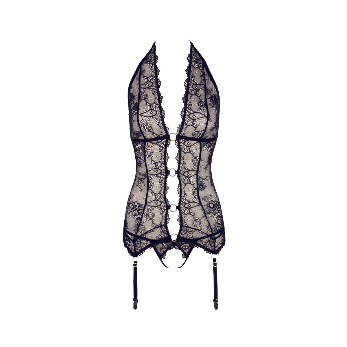 La chemise nera con reggicalze e halterneck è completamente fatta di pizzo raffinato e incanta con un fronte aperto continuo, che è tenuto insieme solo da quattro anelli color oro tempestati di strass. Il materiale morbido offre un elevato comfort e le quattro bretelle sull'orlo del pizzo sono regolabili in lunghezza. Il perizoma abbinato attira con un invitante cavallo aperto.