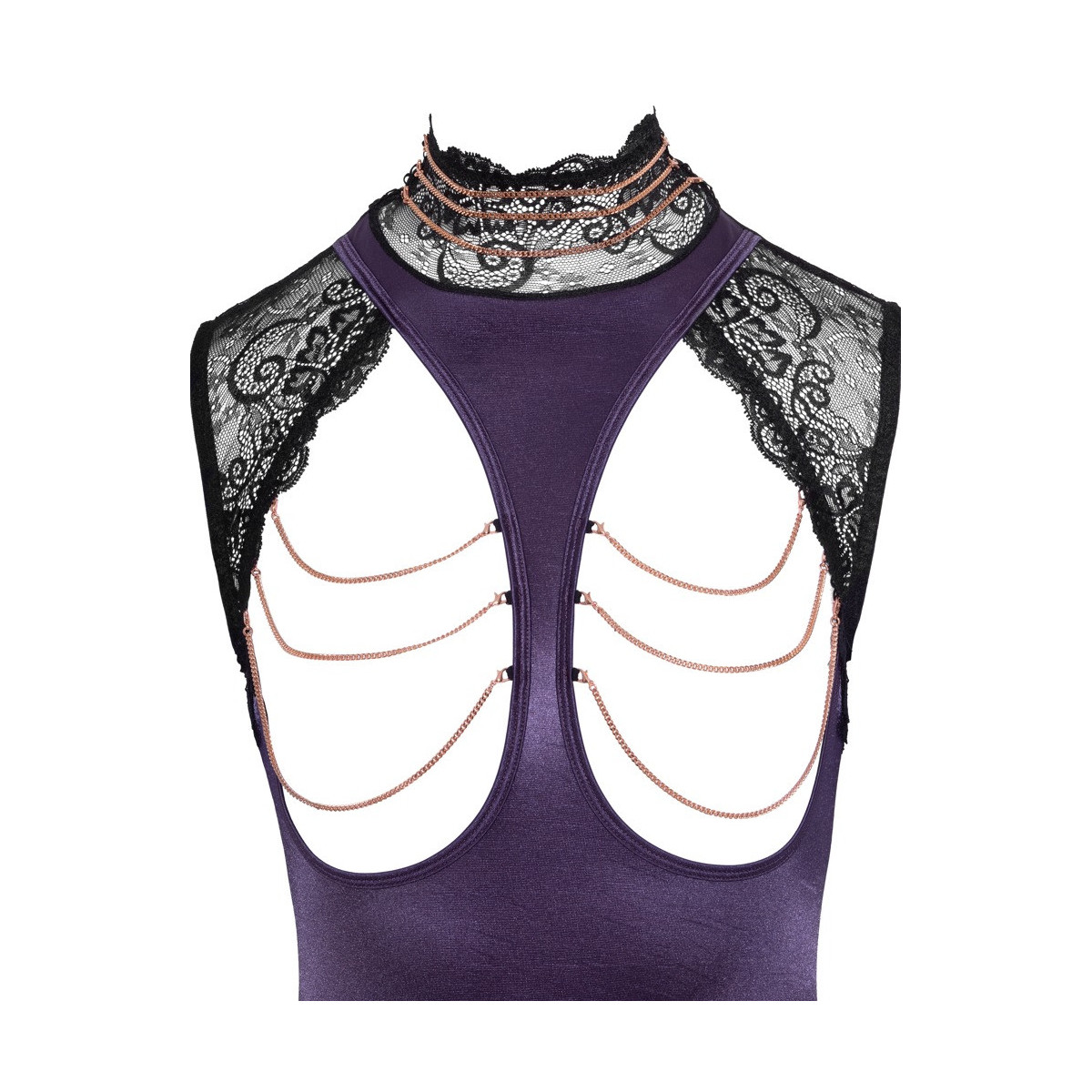 Chemise con busto e reggicalze senza schiena di Abierta Fina in raso viola elastico con fini inserti in pizzo nero e colletto in pizzo con chiusura a 2 bottoni. Scollo davanti decorato con 3 catene. Il busto libero e la schiena sono anche decorati con catene color oro rosa, tutte rimovibili grazie a piccoli moschettoni. Sul retro, la chemise con bretelle ha una chiusura a gancio. Le reggicalze sono regolabili in lunghezza. Il perizoma abbinato ha un invitante cavallo aperto con una stimolante catena al cavallo che è anche rimovibile.