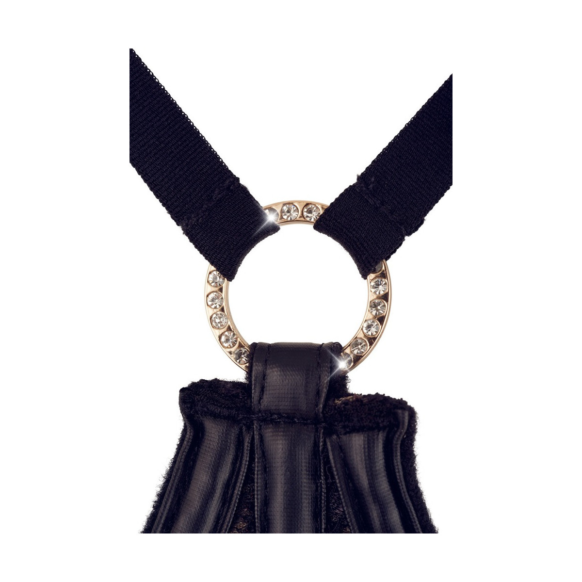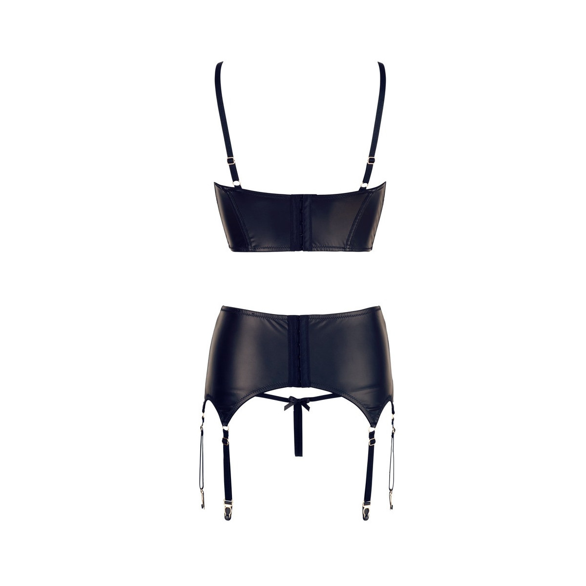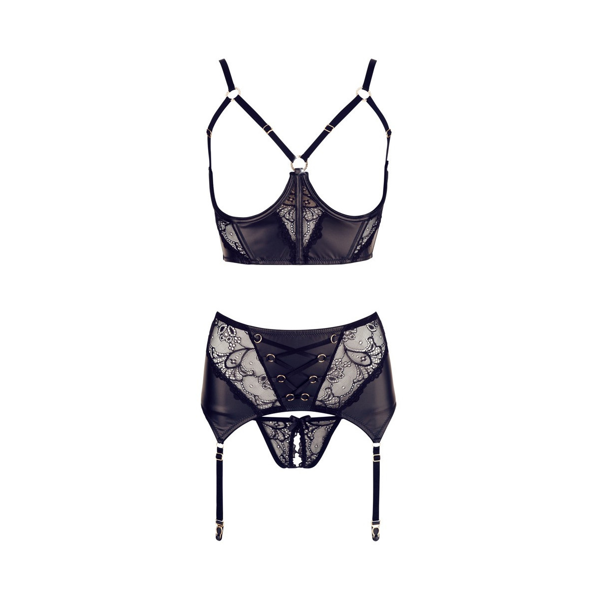 Il set di tre pezzi di bretelle nere con dettagli dorati è un completo di seduzione squisito. Il reggiseno con ferretto con chiusura a gancio e coppe completamente aperte incornicia il tuo seno con spalline strette. L'ampia fascia sottoseno con barre incorporate è fatta di tessuto lucido opaco con inserti di pizzo. Il reggicalze leggermente più largo presenta anche una chiusura a gancio, inserti in pizzo, e tenta con 3 bretelle per lato così come piccole allacciature decorative sul davanti. Il perizoma di pizzo abbinato è invitantemente aperto sul cavallo. Cinghie, spalline e bretelle regolabili.