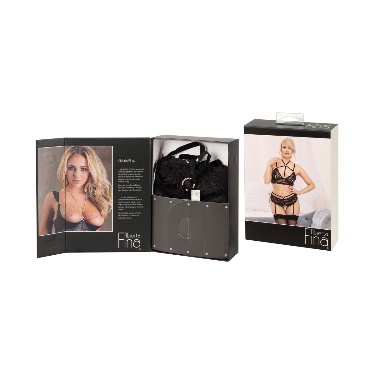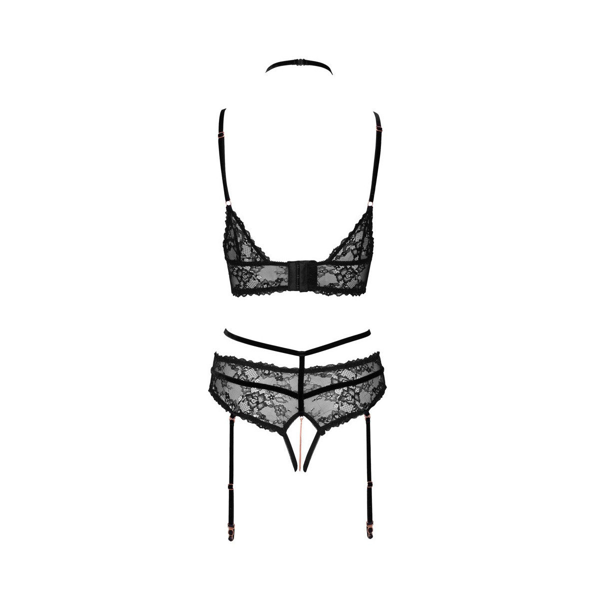 Ouvert bralette e mutandine con reggicalze in un set di Abierta Fina. Pizzo fine e morbido velluto in uno stile eccitante con elementi di metallo color oro rosa e anelli di strass scintillanti. Bralette con coppe a spacco, nastri di velluto sul décolleté e chiusura con gancio sulla schiena. Reggicalze con cavallo aperto in cui scorre una catena stimolante che può anche essere rimossa. Le cinghie di velluto elastico, le bretelle e le bande della scollatura sono regolabili per una vestibilità perfetta - le bretelle sono anche completamente rimovibili.