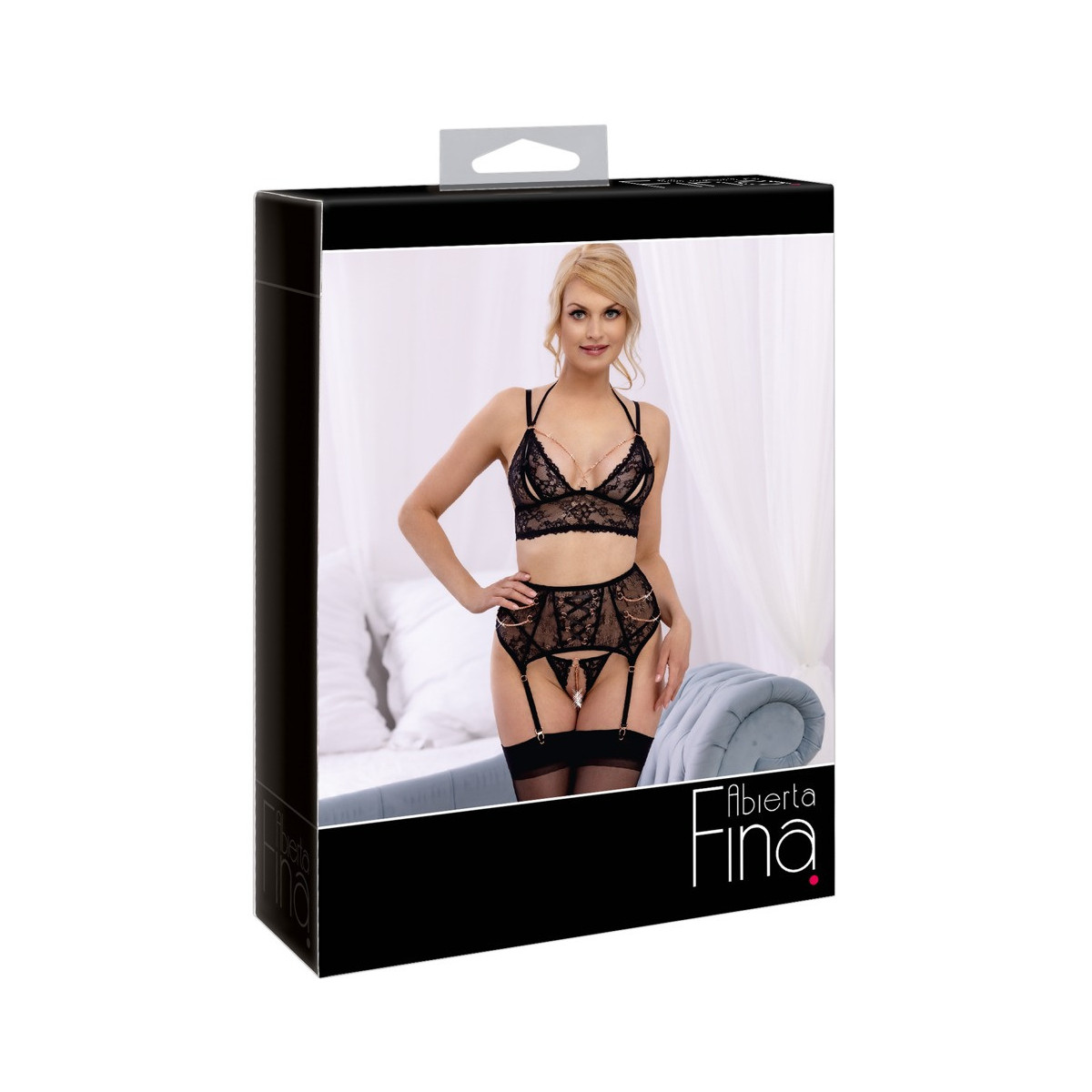 Bralette, reggicalze e mutandine senza cavallo combinati in questo set di Abierta Fina. Tutto è fatto di fine pizzo elastico e adornato con elementi di colore oro rosa e catene decorate con strass. Il bralette con le sue coppe a fessura permette un accesso sensuale. Lo slip completamente inguinale seduce con una catena stimolante. E l'arioso reggicalze con disegno a pizzo completa l'insieme rivelatore in un modo elegantemente erotico. Le spalline, l'halterneck e le bretelle sono regolabili per una vestibilità ottimale. Le catene sono tutte rimovibili.