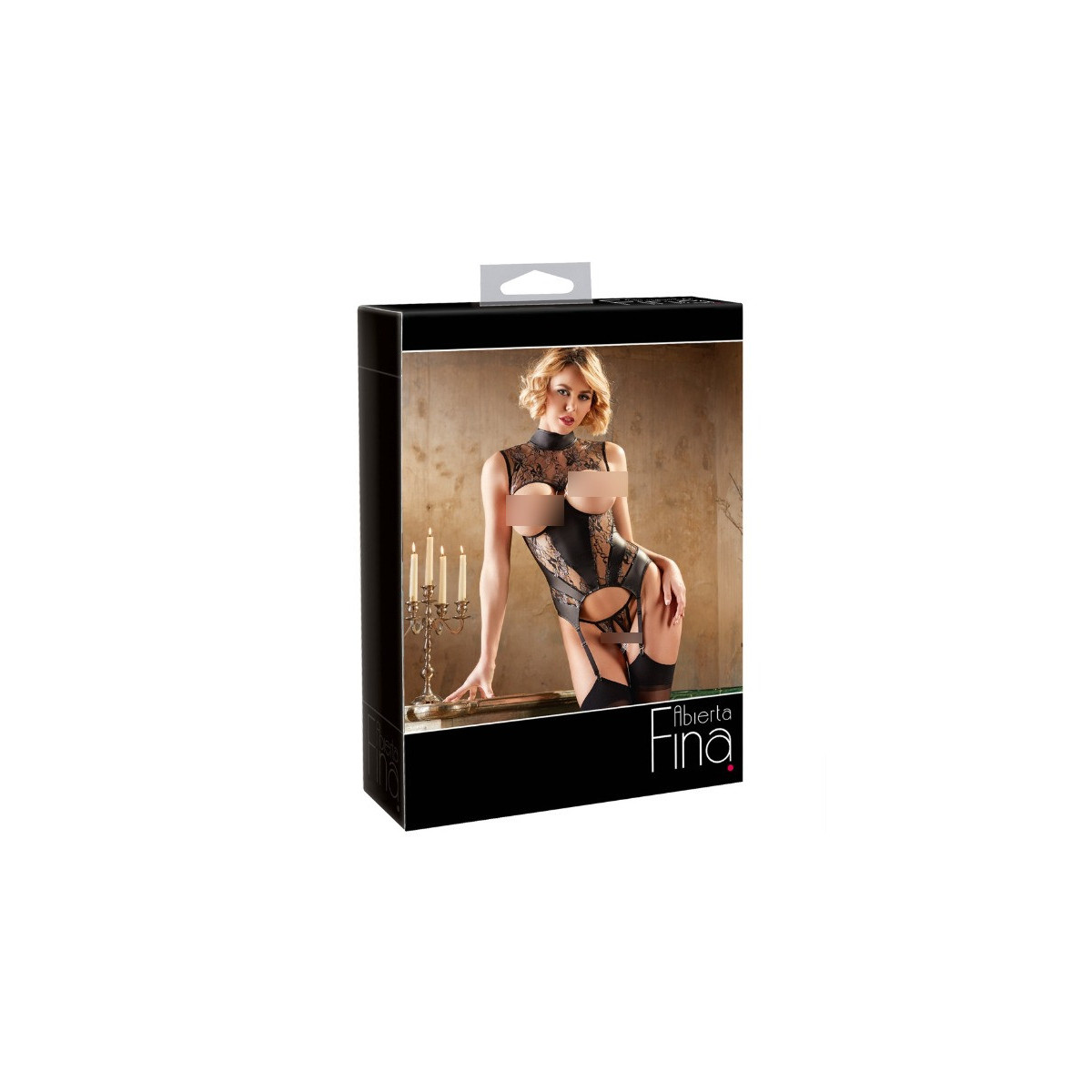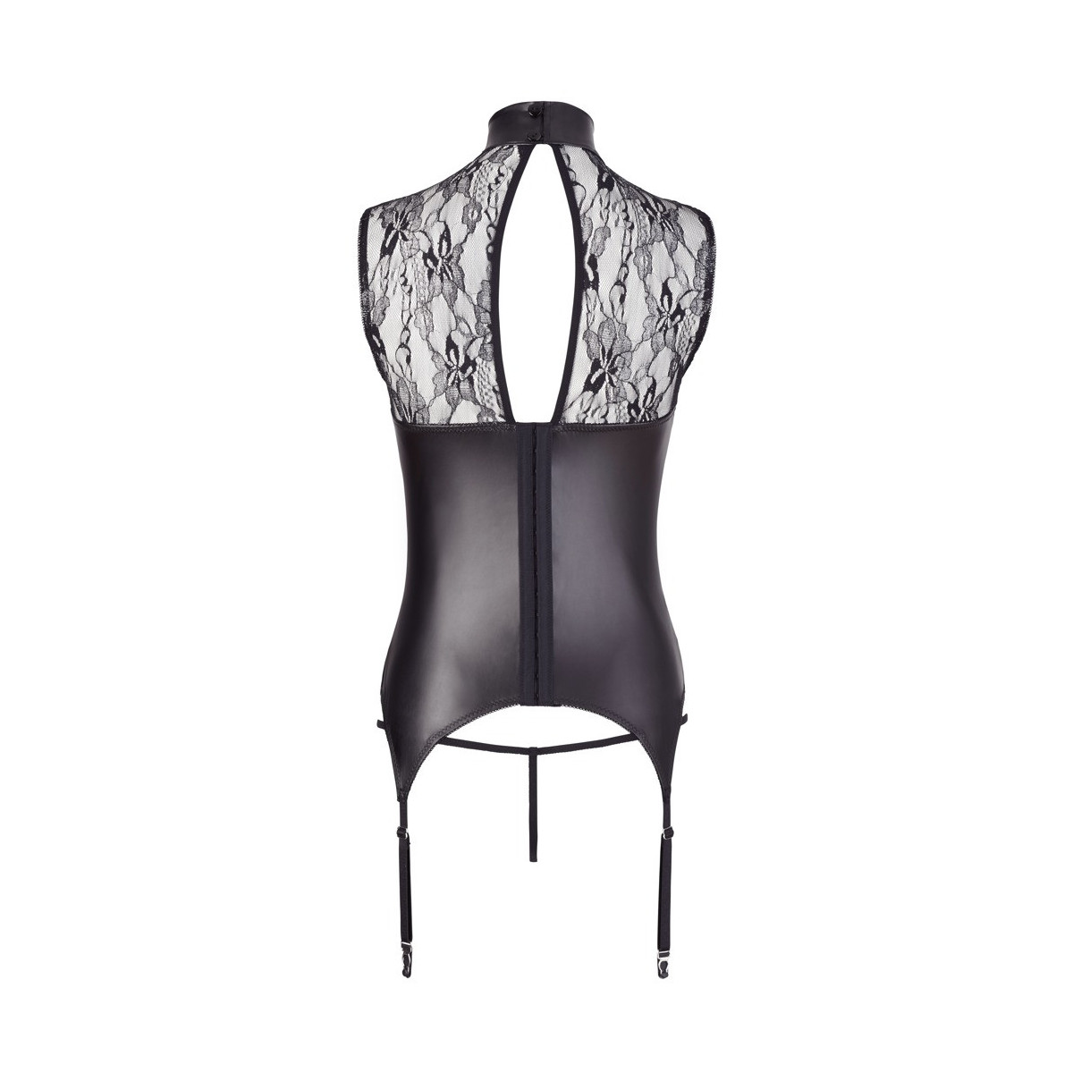 Bretella senza bretelle con collo alto e grande anello di strass davanti. Nella parte posteriore con chiusura a gancio e 2 piccoli bottoni per il colletto. Le bretelle sono regolabili in lunghezza. Realizzato in pizzo a fiori bicolore, ingegnosamente abbinato a inserti in tessuto opaco. Compreso perizoma in pizzo senza cavallo.