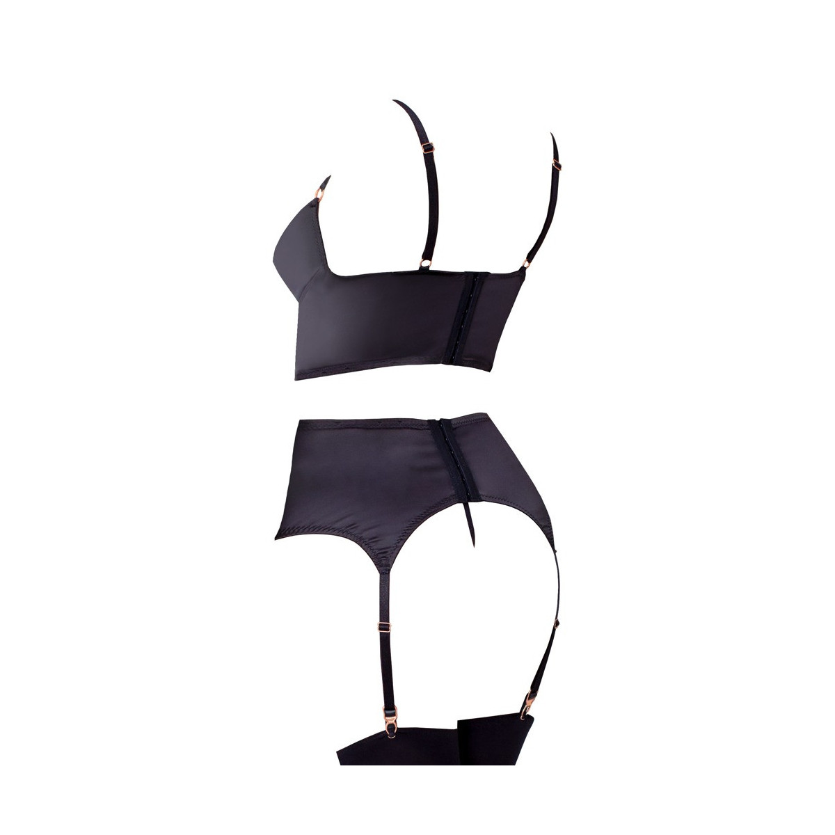 Reggiseno con ferretto leggermente foderato, reggicalze e perizoma ouvert di Abierta Fina in nobile raso nero elasticizzato con dettagli color oro rosa. Il ferretto è tagliato più lungo, ha una chiusura a gancio sulla schiena e spalline regolabili. Il reggicalze dal taglio ampio ha anche una chiusura a gancio sul retro e bretelle regolabili. Entrambi i pezzi sono rifiniti con una catena di pizzo sul davanti. Il perizoma abbinato ha una catena rimovibile nel cavallo completamente aperto.