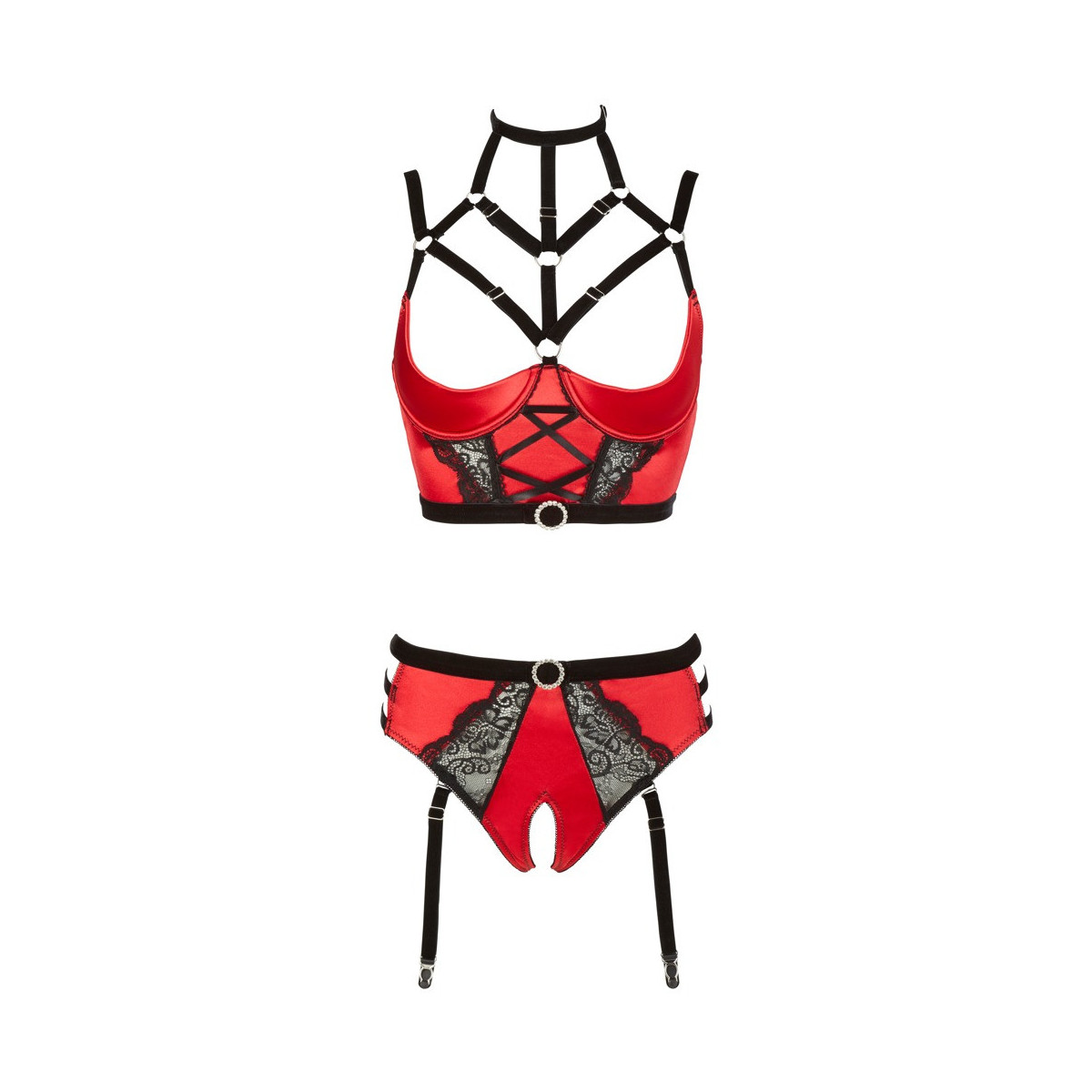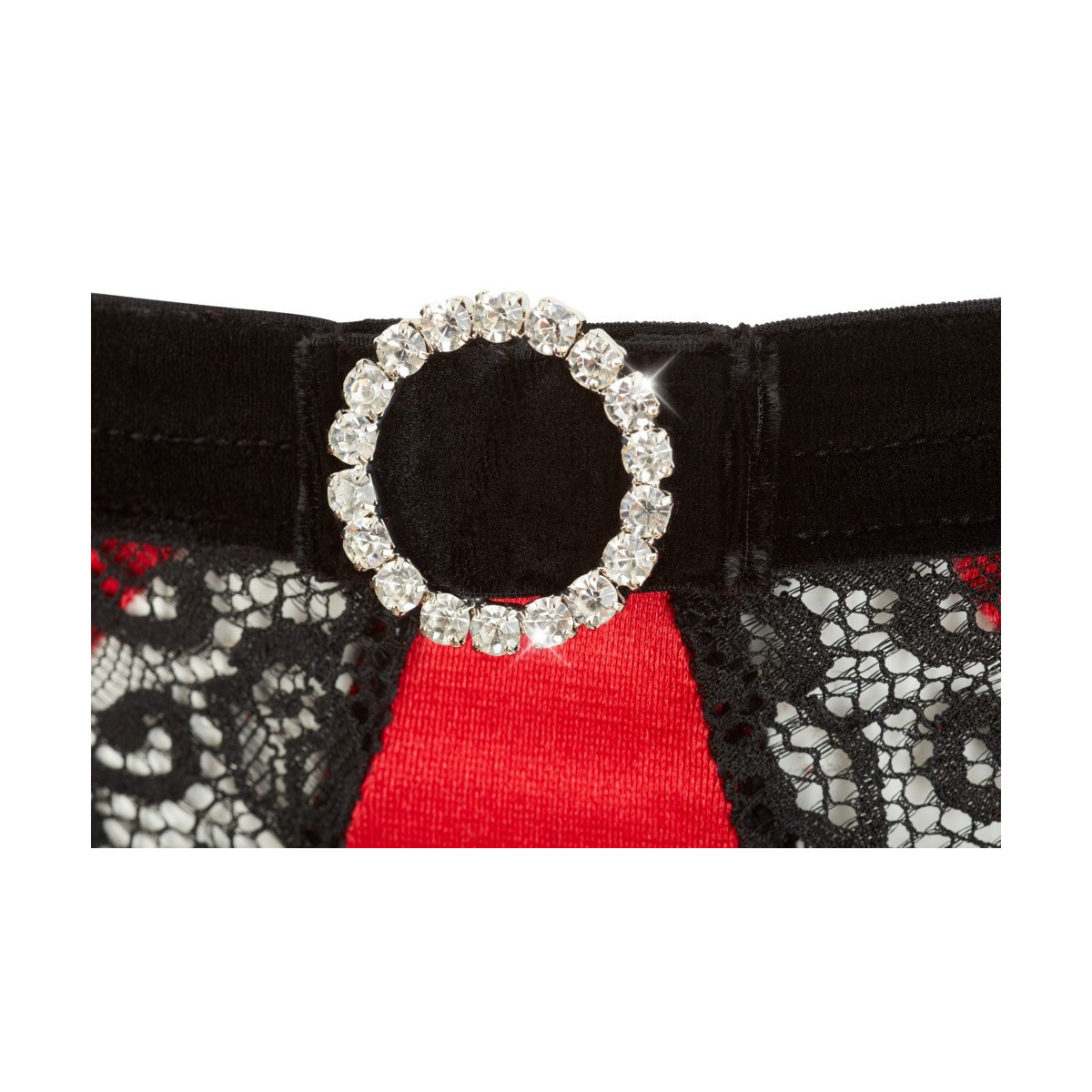 Sensuale bustier in raso con alzatina leggermente foderata con ferretto e dettagli di cinturino regolabile, compreso il collare regolabile. Con inserti in pizzo semitrasparente e allacciatura decorativa sul sottobusto. Un anello di strass in vita anteriore completa l'aspetto. Gli slip senza cavallo abbinati sono tagliati all'altezza della vita e hanno bretelle regolabili e rimovibili. Si tiene ai fianchi con 3 cinghie elastiche. Con un ulteriore anello di strass in vita e inserti di pizzo semitrasparenti sul davanti e sul retro.