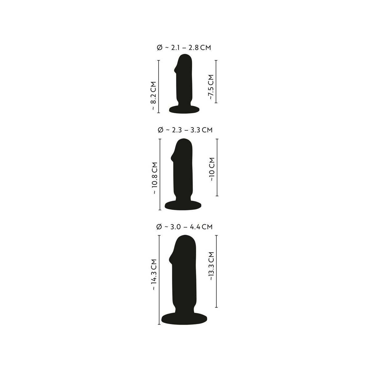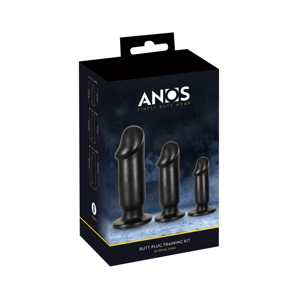 Butt Plug Training Kit di ANOS con 3 plugs anali di diverse dimensioni e pesi per una stimolazione eccitante e un perfetto allenamento all'allungamento delle natiche. Ogni plug flessibile ha un glande modellato e una grande base di aspirazione per un'azione anale sicura (permanente) senza scivolare e senza mani.