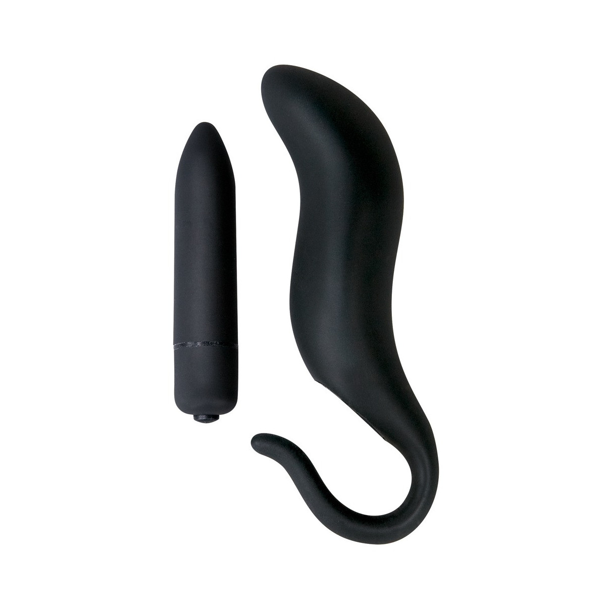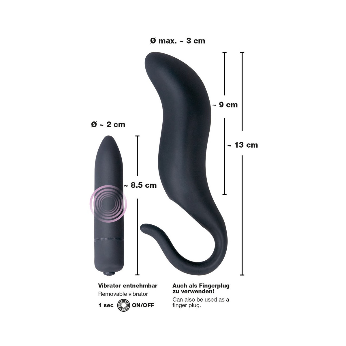 Spina nera con superficie soft-touch e vibratore rimovibile, può essere utilizzata anche come spina per le dita. 13 cm di lunghezza totale, Ø 3 cm. La forte vibrazione è regolabile con la semplice pressione di un pulsante. Materiale: silicone, ABS. Comprese 4 batterie a bottone.