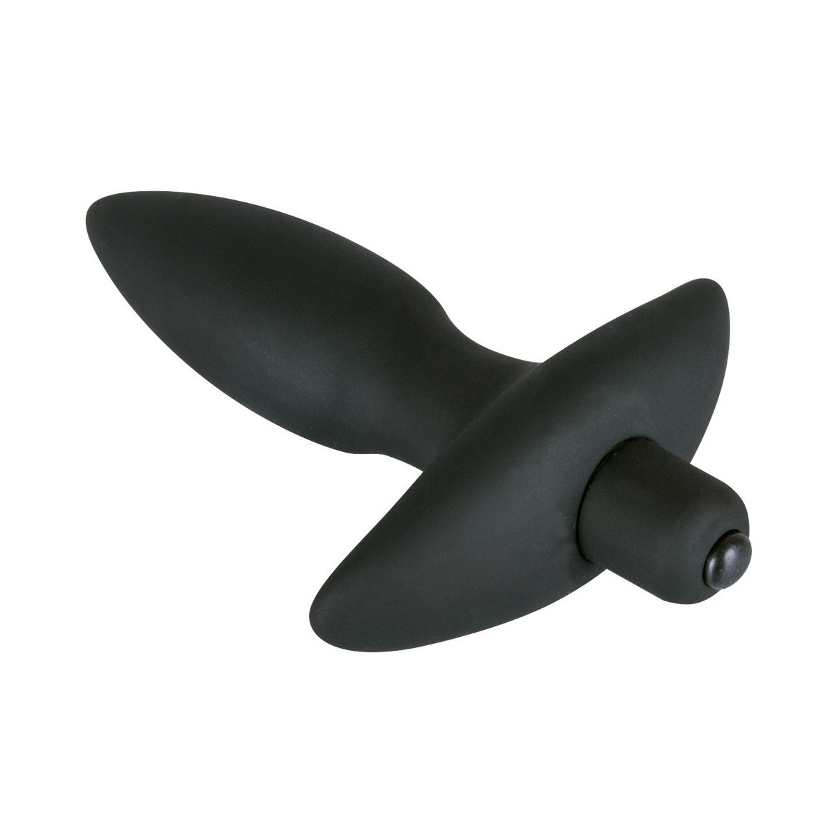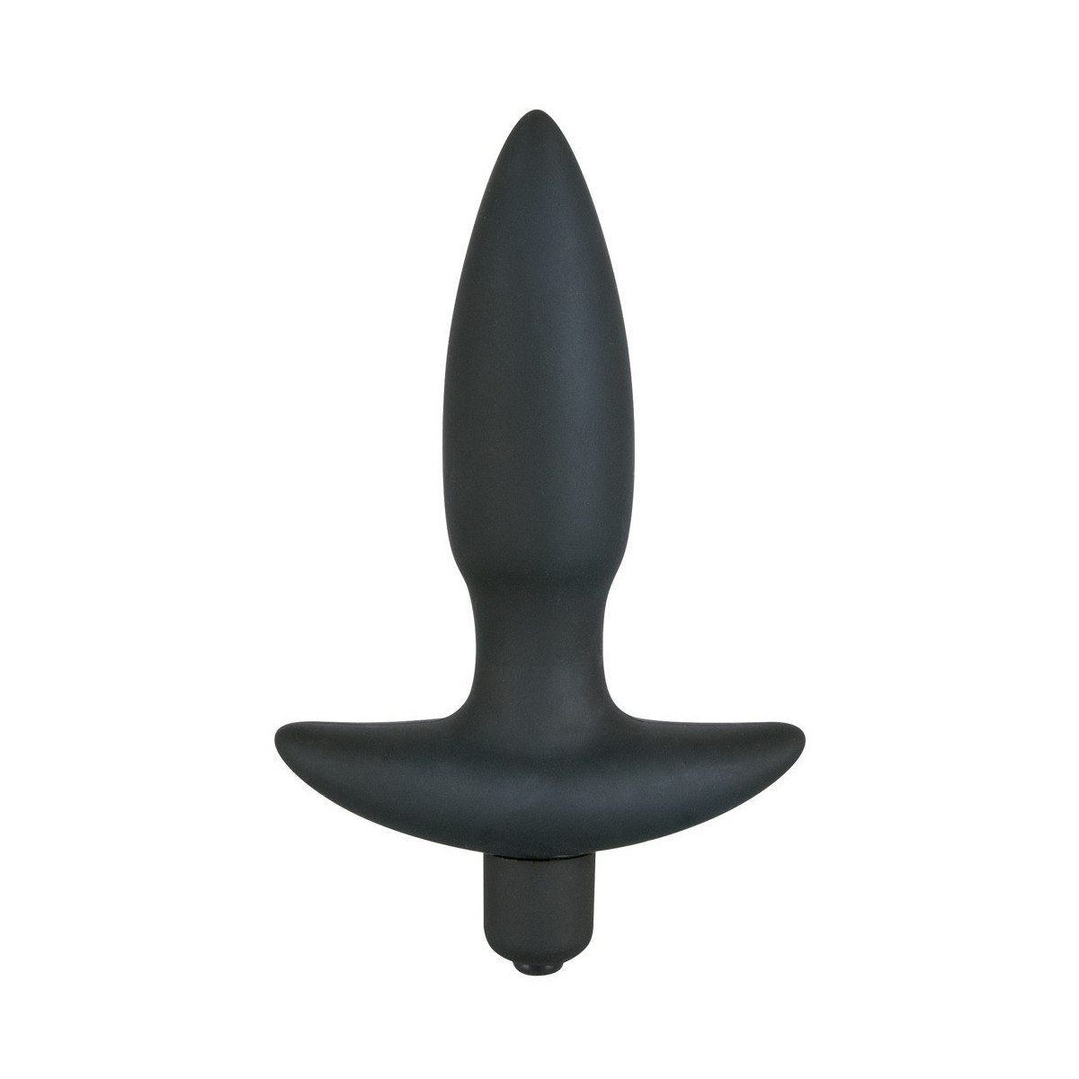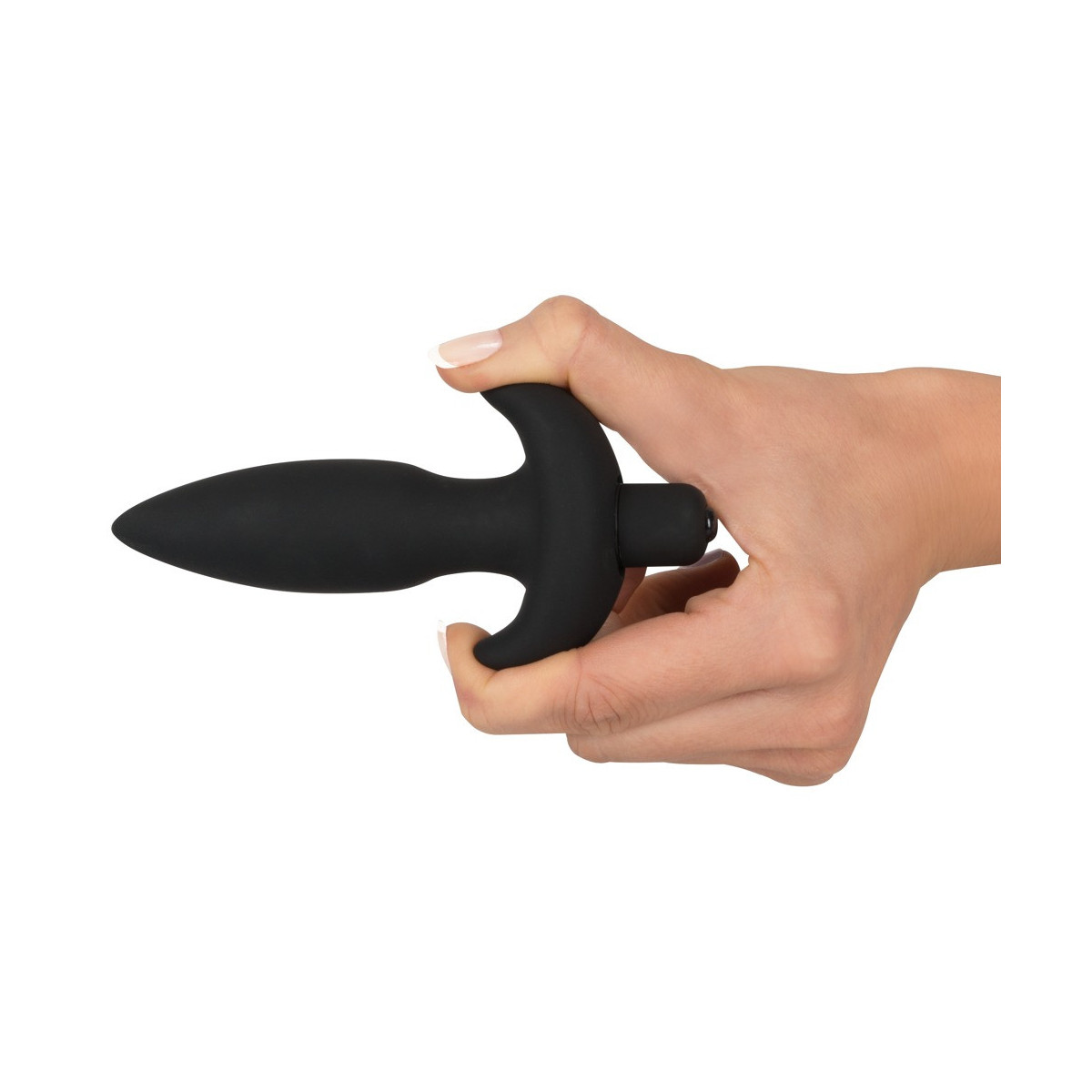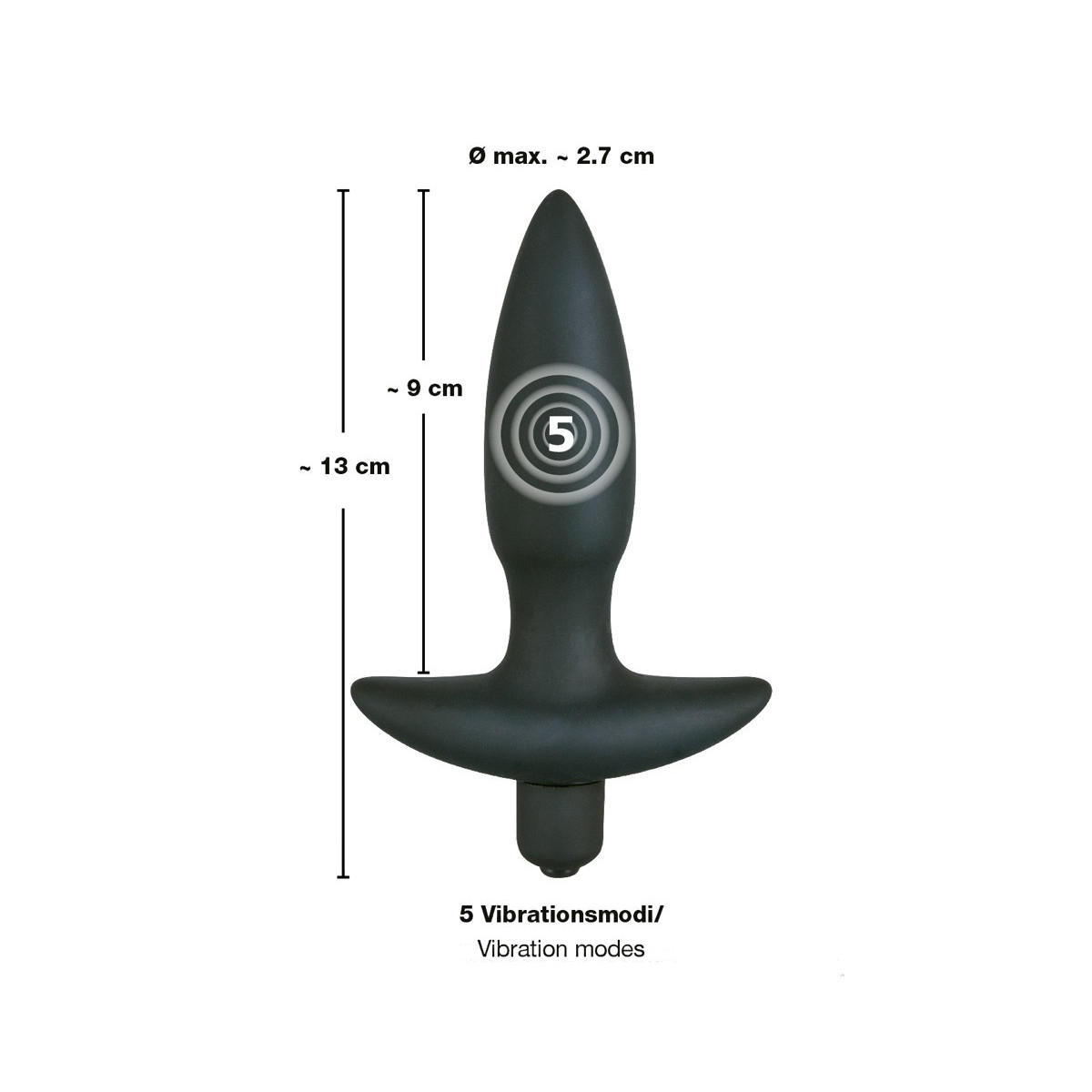 Spina anale nera con vibrazione a 5 fasi con la semplice pressione di un pulsante. Con maniglia di ritorno. Lunghezza totale 13 cm, profondità di inserimento 9 cm. Ø da 1,9 cm a 2,7 cm. Materiale: silicone. (Si prega di ordinare la batteria separatamente: 1 x Micro/AAAA).