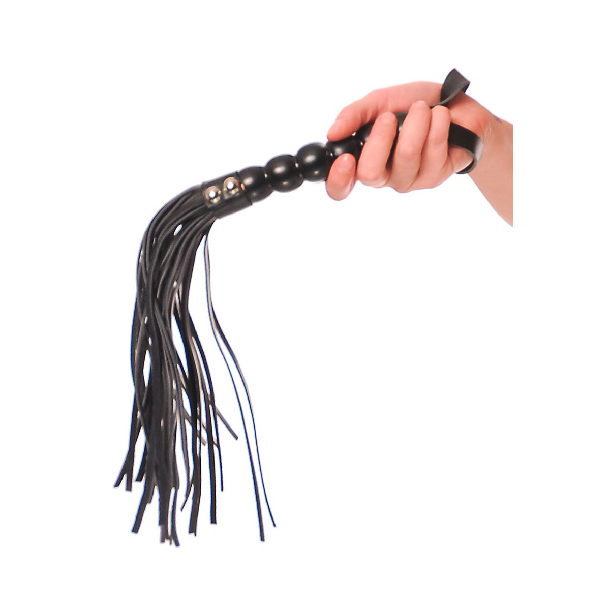 Per i giochi di lussuria e di sottomissione questa frusta è proprio l'utensile giusto. L'impugnatura a sfera si adatta bene alla mano e con le morbide cinghie di finta pelle ognuno ottiene esattamente quello che si merita: accarezzare o con le maniere forti.