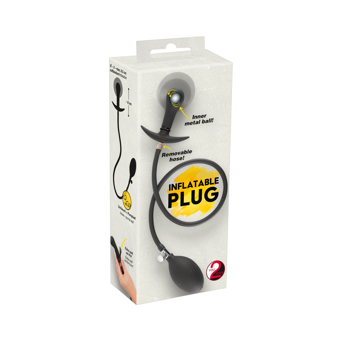 Con questo tappo superlativo ci si sente completamente riempiti all'interno. La punta affusolata e la superficie carezzevole scivolano senza sforzo, mentre il tappo impedisce una penetrazione troppo profonda. Gonfiare il tappo è molto facile con la sfera di pompaggio, e sgonfiare l'aria è anche molto semplice e veloce con la pratica valvola. Il tubo flessibile stesso è rimovibile e il tappo perde aria solo lentamente.