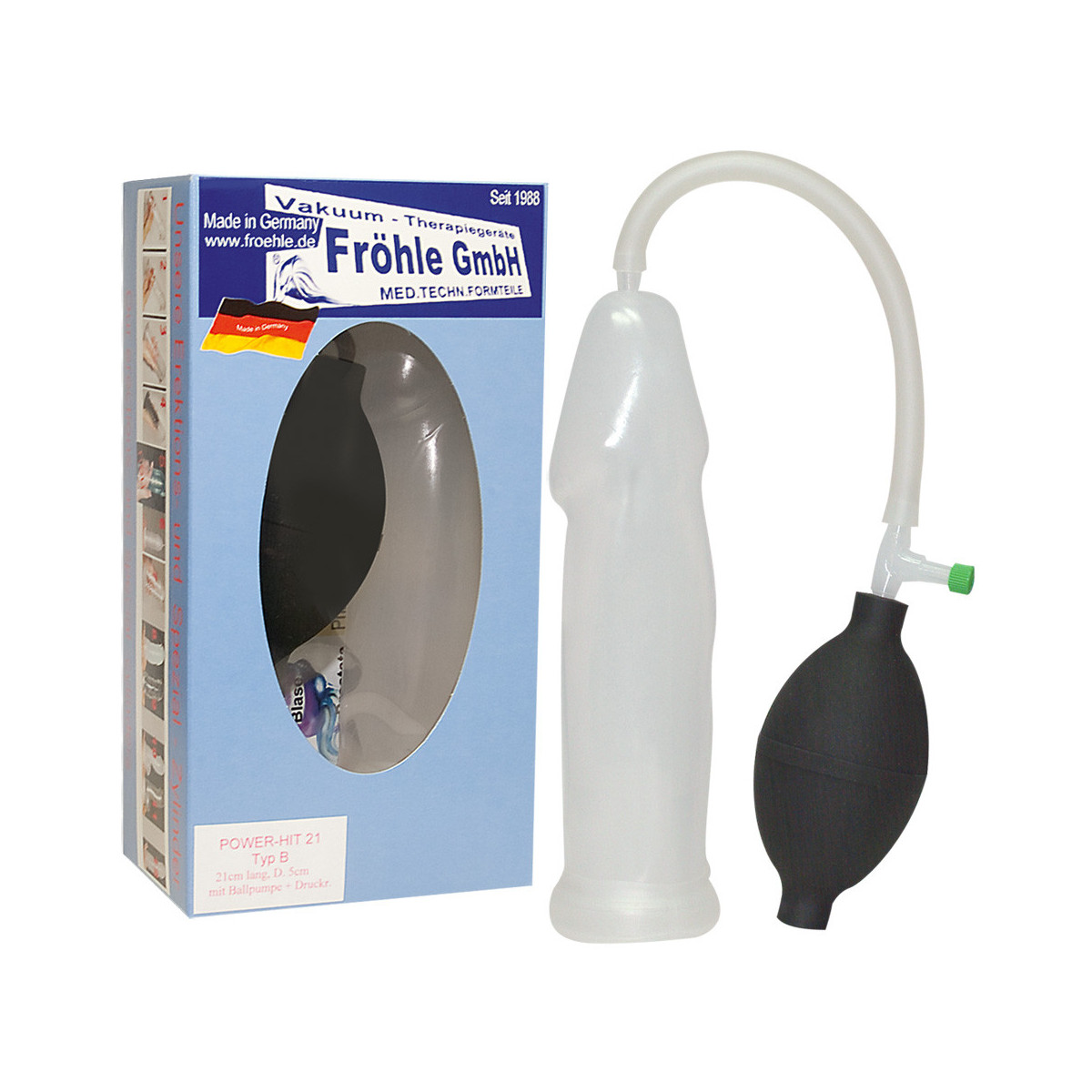 Pompa per il pene in materiale piacevolmente flessibile per una perfetta vestibilità. In un'attraente forma anatomica del pene e con una pratica pompa a sfera per una magnifica erezione in poco tempo. Usato regolarmente, la potenza maschile può essere migliorata in modo permanente - anche in caso di disfunzione erettile. Può anche essere combinato con il bracciale FRÖHLE per l'amore e la potenza per sostenere ulteriormente la potenza maschile. Incluso il tubo di collegamento, la valvola, il manicotto di chiusura e il bracciale del tubo.