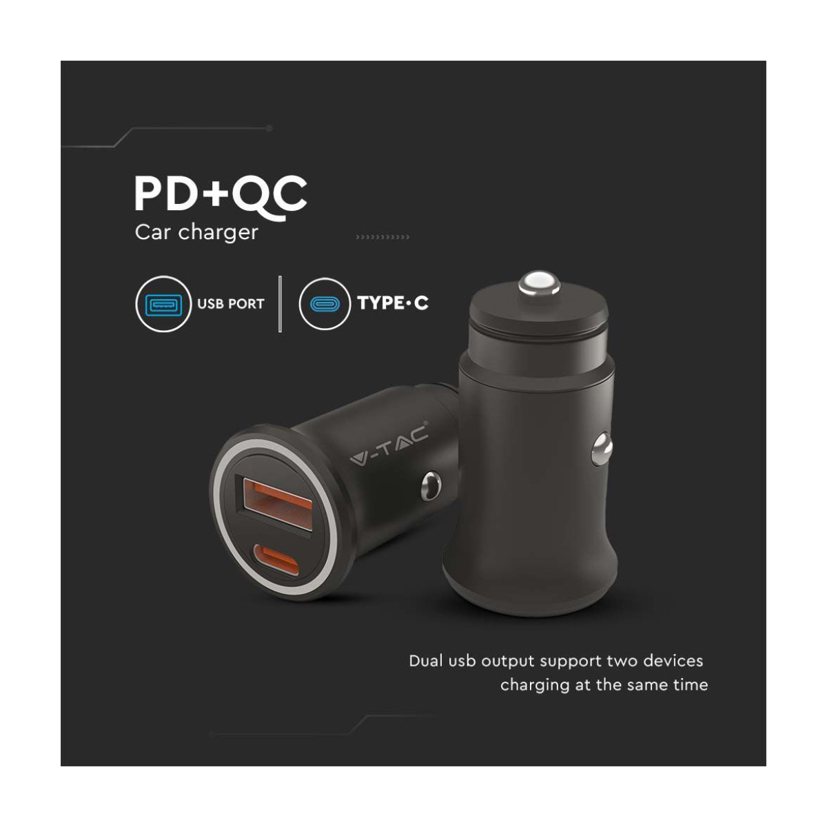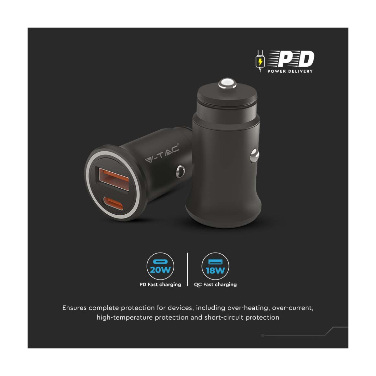 V-TAC Caricatore Auto Accendisigari USB PD 20W+USB QC 18W