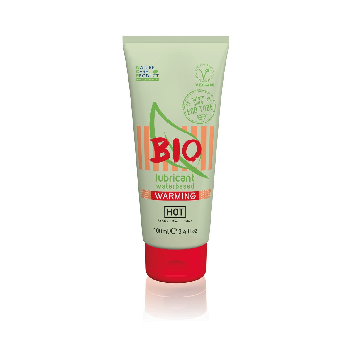 Gel lubrificante riscaldante biologico e vegano a base d'acqua BIO di HOT. Dà un'eccitante sensazione di calore dopo l'applicazione. Dà una sensazione di pelle morbida come la seta. 100 ml in un tubo ecologico realizzato con materie prime rinnovabili.